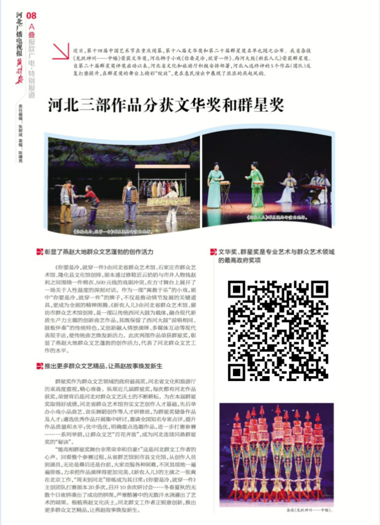 第十八届文华奖第二十届群星奖揭晓,河北三部作品分获文华奖和群星奖 我省杂技《龙跃神州——中幡》荣获文华奖,河北梆子小戏《你要是冷,就穿一件》、西河大鼓《新农人儿》荣获群星奖。文华奖、群星奖由文化和旅游部评选,是专业艺术与群众艺术领域的最高政府奖项(识别图片上的二维码关注阅览)。