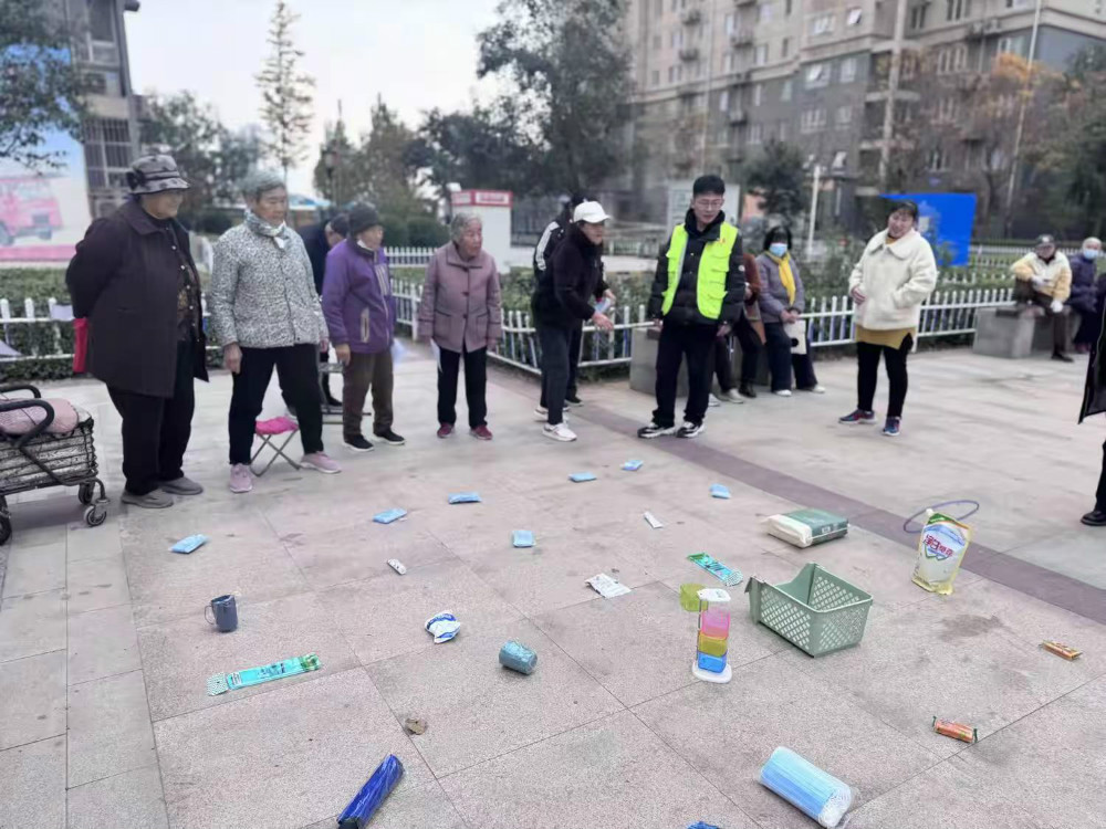 在抱球绕障碍物项目中,老人们双手紧抱气球,小心翼翼地绕过锥形桶,动作虽缓但稳,不时引来围观者的阵阵加油声;有老人不慎让气球滑落,也笑着快速捡起重新出发,脸上洋溢着不服输的韧劲。你比划我来猜项目成为现场最具人气的环节。搭档们一人通过肢体动作和简单提示传递信息,一人凝神思索抢答,默契配合间满是欢乐。垃圾分类投沙包与套圈项目前也排起了长队。垃圾分类投沙包将环保知识与运动相结合,老人们需将写有不同垃圾名称的沙包投入对应分类格子,在游戏中巩固环保理念;套圈项目里,老人们手持套圈凝神瞄准,小到牙膏、香皂,大到食用盐、洗衣液,丰富的奖品让大家热情高涨,不时有人欢呼“中了!中了!”,收获满满的笑容格外灿烂。