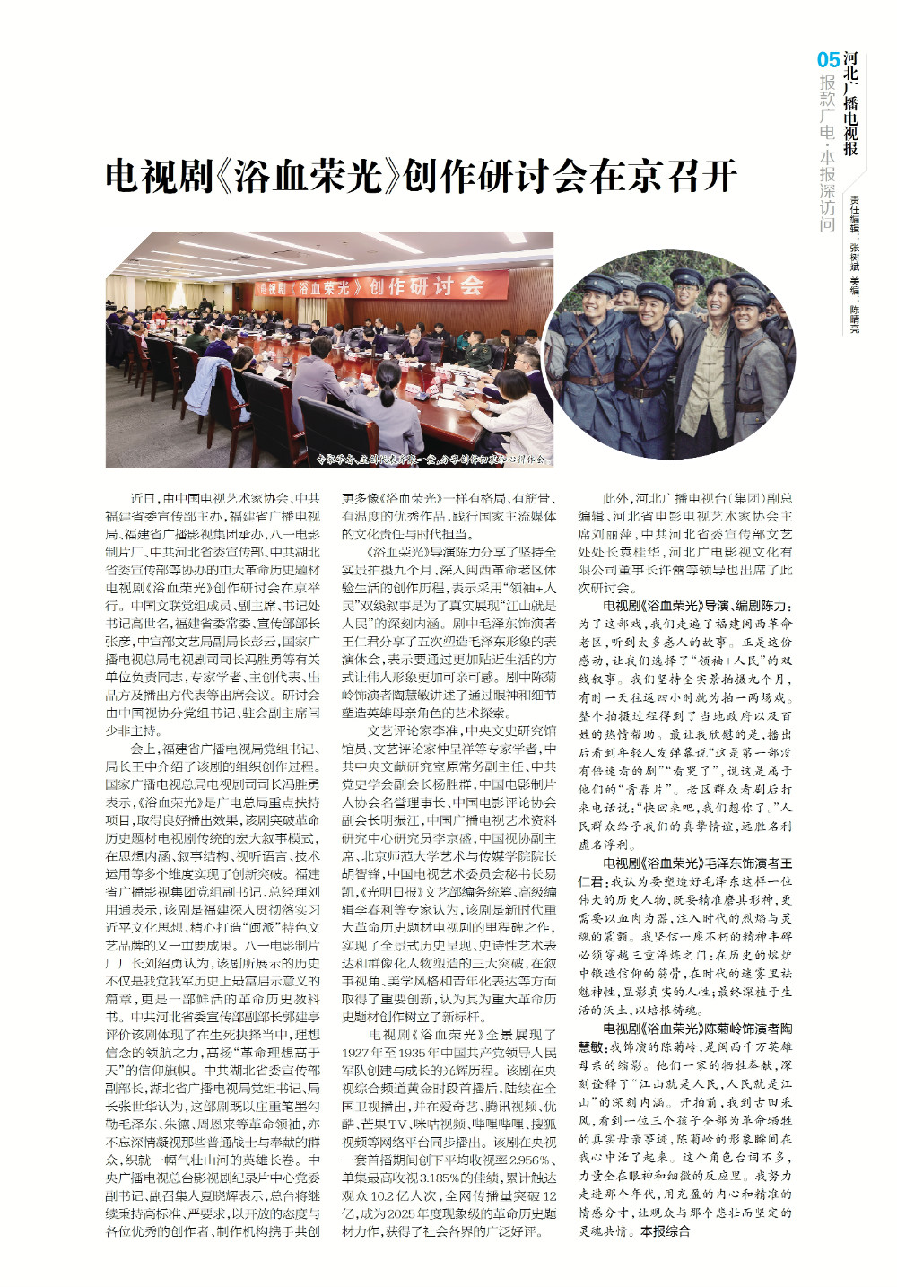 国+社区新媒体报道 近日,由中国电视艺术家协会、中共福建省委宣传部主办,福建省广播电视局、福建省广播影视集团承办,八一电影制片厂、中共河北省委宣传部、中共湖北省委宣传部等协办的重大革命历史题材电视剧《浴血荣光》创作研讨会在京举行。中国文联党组成员、副主席、书记处书记高世名,福建省委常委、宣传部部长张彦,中宣部文艺局副局长彭云,国家广播电视总局电视剧司司长冯胜勇等有关单位负责同志,专家学者、主创代表、出品方及播出方代表等出席会议。研讨会由中国视协分党组书记、驻会副主席闫少非主持。