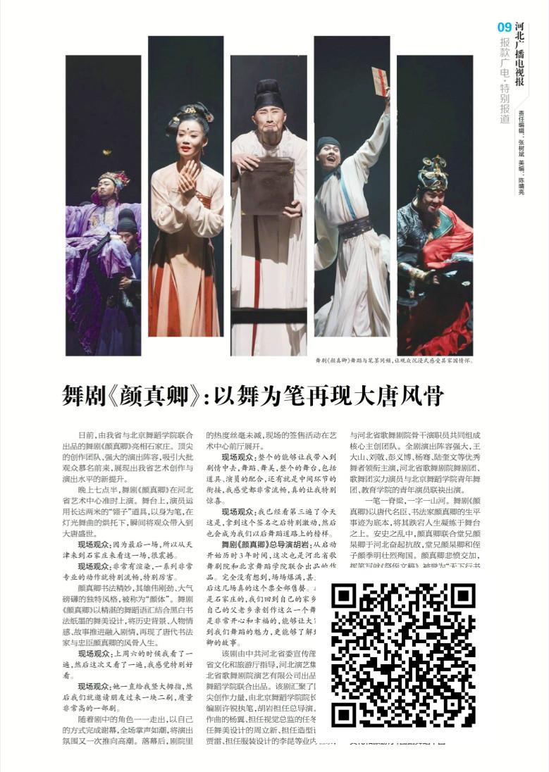 舞剧《颜真卿》:以舞为笔再现大唐风骨 日前,由我省与北京舞蹈学院联合出品的舞剧《颜真卿》亮相石家庄。顶尖的创作团队、强大的演出阵容,吸引大批观众慕名前来,展现出我省艺术创作与演出水平的新提升(识别图片上的二维码关注阅览)。