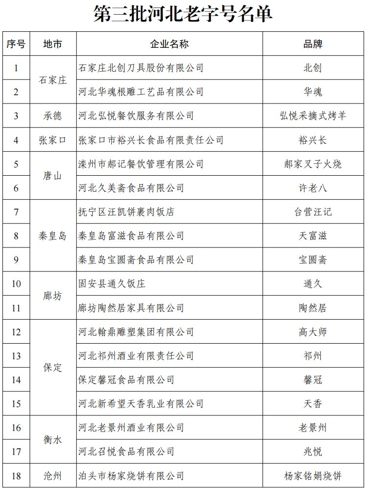 最新!又一批河北老字号名单公布 按照《河北老字号认定管理办法》《“河北老字号”评价规范》(DB13/T5878-2023)等有关要求,省商务厅会同省文化和旅游厅、省市场监管局、省文物局、省知识产权局,组织开展了第三批河北老字号认定和第一批河北老字号复核工作,经企业申报、各市初审、专家评审、社会公示等程序,确定了第三批河北老字号名单和第一批河北老字号通过复核名单,现予公布。