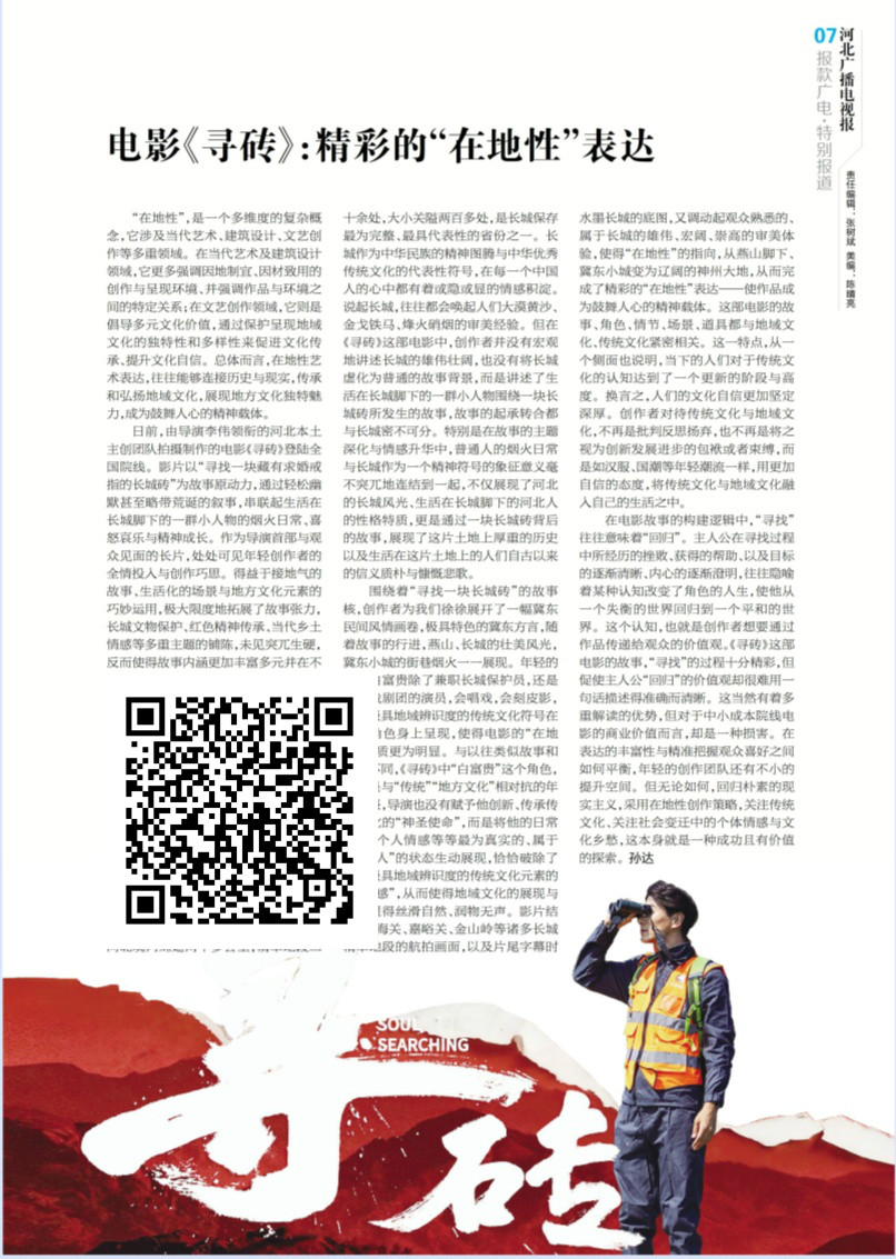 电影《寻砖》:精彩的“在地性”表达 围绕着“寻找一块长城砖”的故事核,创作者为我们徐徐展开了一幅冀东民间风情画卷,极具特色的冀东方言,随着故事的行进,燕山、长城的壮美风光,冀东小城的街巷烟火一一展现(识别图片上的二维码关注阅览)。