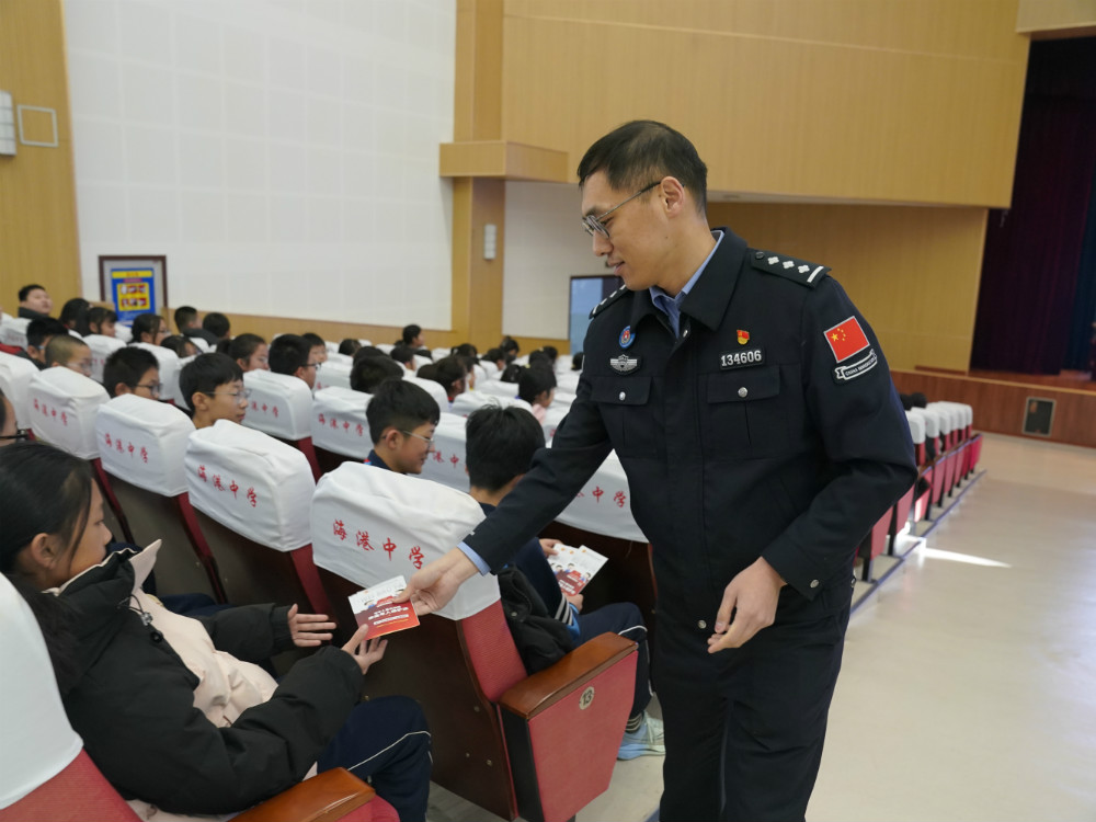 同时,民警围绕《未成年人保护法》《治安管理处罚法》相关内容,聚焦校园欺凌问题,以案例分析、情景模拟方式,讲解其表现形式、法律后果及防范应对方法,引导学生学会用法律武器维护自身权益。海港开发区第六中学校长赵春凤评价:“接地气的普法形式,让孩子们既学知识,又感受法治温度。”