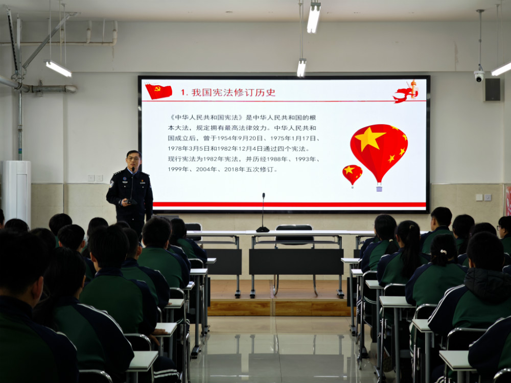 活动中,民警以“新中国第一部宪法是怎样诞生的”为切入点,组织学生观看影像资料,直观呈现宪法历史渊源与立法初心。通过“宪法知识快问快答”互动,结合校园生活、社会交往典型案例,用“身边事”解读“大法律”,打破认知误区,让学生感受宪法对公民权利的保障,牢固树立“宪法至上”理念。