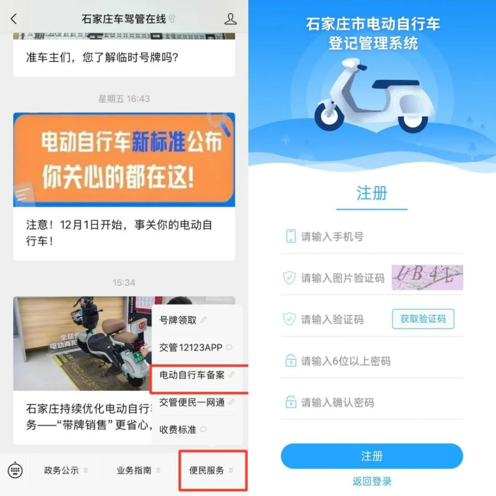 市民通过微信公众号“石家庄公安交警”→“微警务”→“电动自行车备案”,或“石家庄车驾管在线”→“便民服务”→“电动自行车备案”,进入“石家庄市电动自行车登记管理系统”。使用本人手机号注册,上传身份证正反面照片,完成个人信息登记。