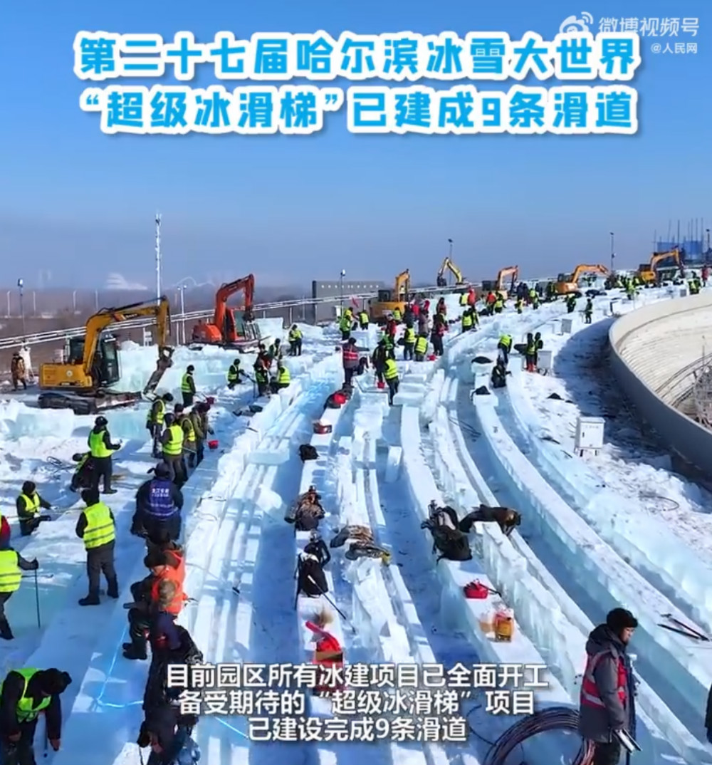 哈尔滨超级冰滑梯已建成9条滑道 第二十七届哈尔滨冰雪大世界园区所有冰建项目全面开工,备受期待的“超级冰滑梯”项目已建成9条滑道。今年,超级冰滑梯不仅延续了往年超长滑道带来的畅快体验,更在外观设计上融入网友建议,特别融入“长城”中城墙和烽火台的造型。