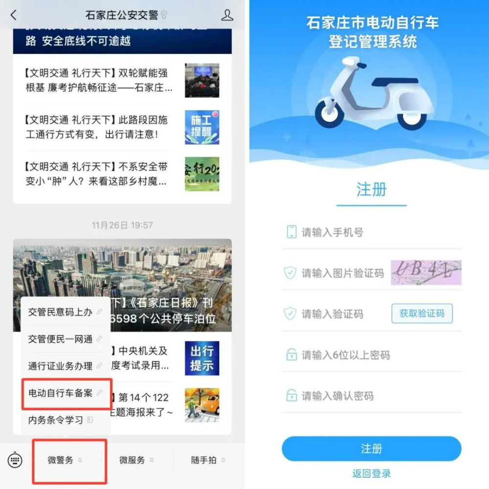 石家庄持续优化电动自行车登记上牌服务 为持续方便市民办理电动自行车登记上牌,石家庄市公安局交通管理局依托“石家庄公安交警”“石家庄车驾管在线”微信公众号,长期提供线上备案服务,并结合“带牌销售”网点,形成线上线下双轨并行的便捷办理模式。市民可根据自身购车情况,选择最便利的途径为符合新国标的爱车办理“身份证”。 详情点击http://guojiashequ.hebtv.com/news/detail/19840