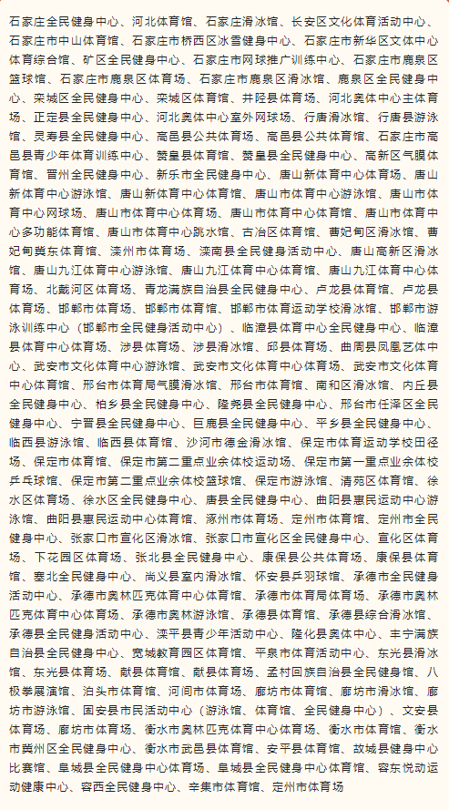河北142家体育场馆免费或低收费开放 日前,国家体育总局办公厅印发《关于公布2026年接受中央资金补助向社会免费或低收费开放公共体育场馆和2025年未按规定向社会开放场馆名单的通知》,明确2026年中央补助资金已提前下达。其中,包括河北142家体育场馆。