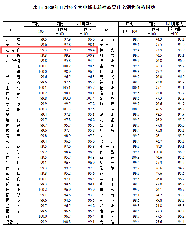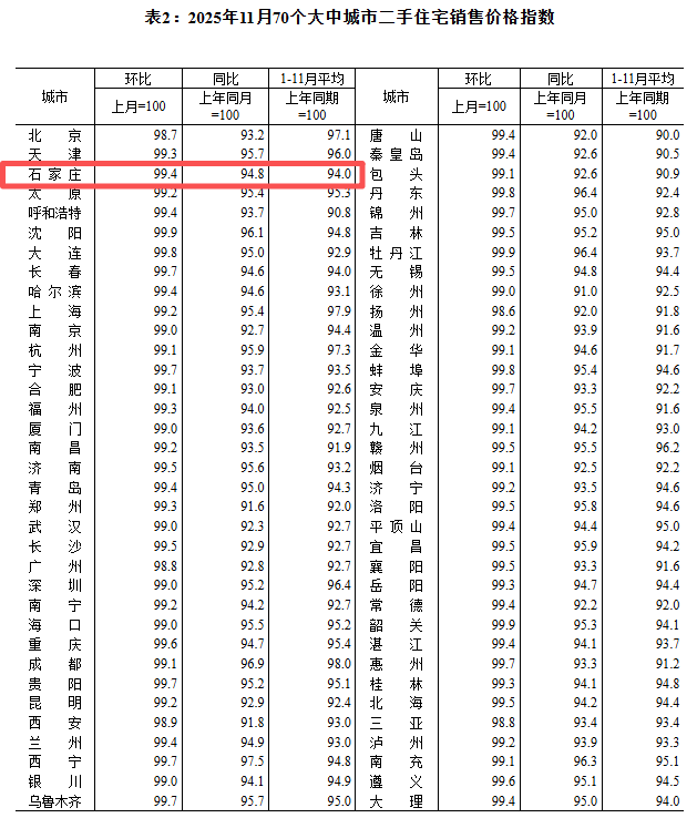 石家庄房价涨了跌了? 11月份,70个大中城市中,新房价格环比上涨城市个数增加,二、三线城市降幅收窄。其中石家庄新房价格环比下降0.5%,同比下降4.1%;二手房价格环比下降0.6%,同比下降5.2%。
