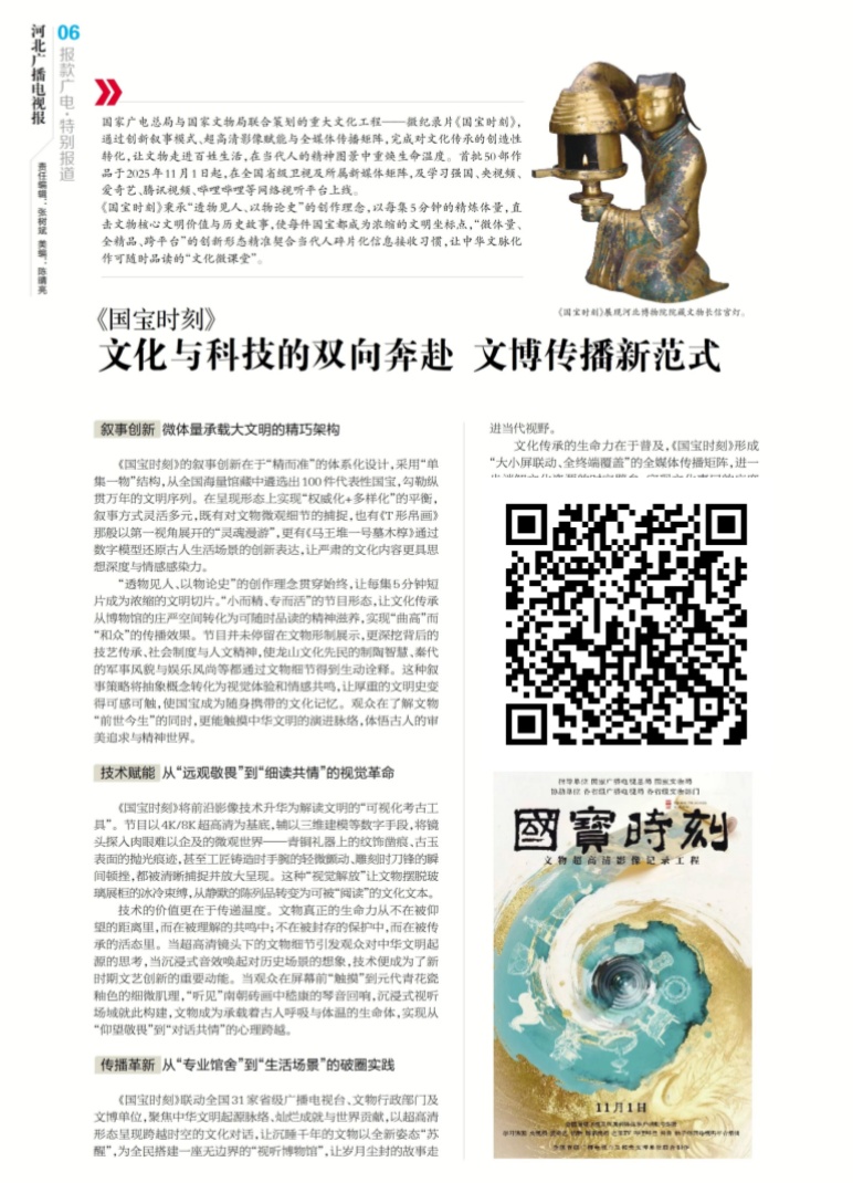 《国宝时刻》——文化与科技的双向奔赴 文博传播新范式 《国宝时刻》秉承“透物见人、以物论史”的创作理念,以每集5分钟的精炼体量,直击文物核心文明价值与历史故事,使每件国宝都成为浓缩的文明坐标点,“微体量、全精品、跨平台”的创新形态精准契合当代人碎片化信息接收习惯,让中华文脉化作可随时品读的“文化微课堂”(识别图片上的二维码关注阅览)。