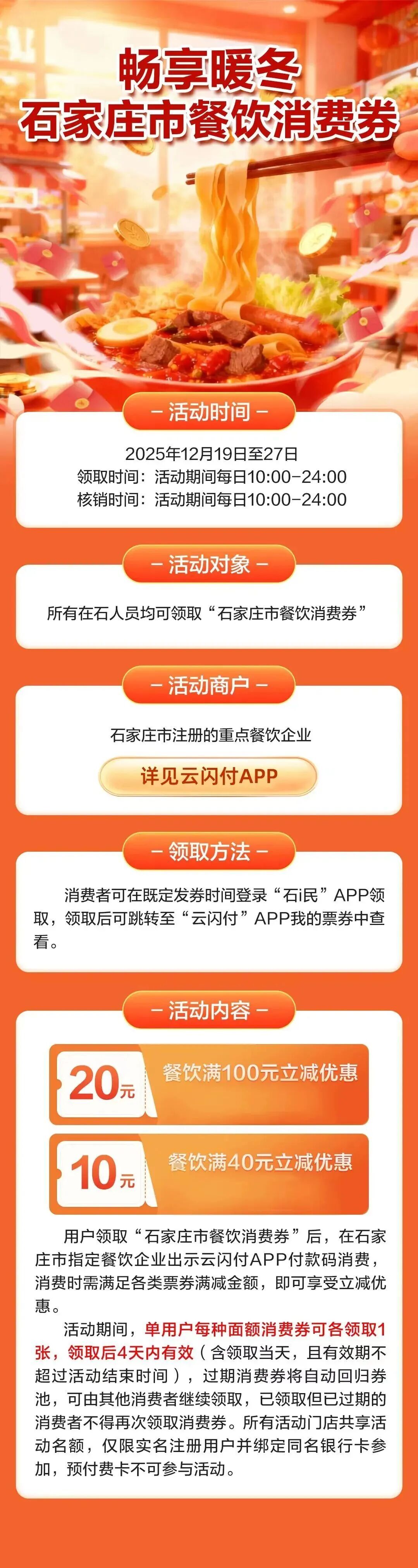 石家庄发消费券啦!怎么领? 12月19日至27日,所有在石家庄人员均可领取“石家庄市餐饮消费券”,餐饮满100元立减20元,满40元立减10元。12月19日至21日,“乐享都市圈·品味老字号”石家庄都市圈美食联展将在石家庄织音1953园区启幕,石家庄、邢台、衡水、辛集、定州五地美食组团报到,34家首批石家庄“老字号”企业集体亮相。