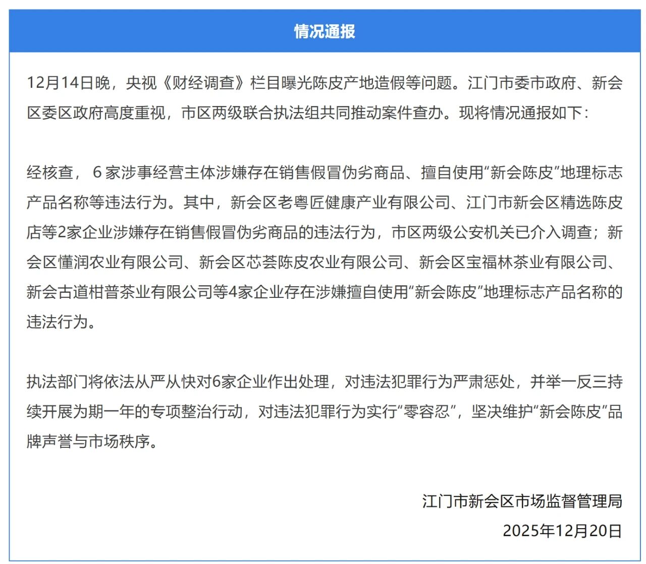 广东江门通报陈皮产地造假问题:严肃惩处6家涉事经营主体 12月20日,广东江门市新会区市场监督管理局发布情况通报称,12月14日晚,央视《财经调查》栏目曝光陈皮产地造假等问题。江门市委市政府、新会区委区政府高度重视,市区两级联合执法组共同推动案件查办。现将情况通报如下:经核查,6家涉事经营主体涉嫌存在销售假冒伪劣商品、擅自使用“新会陈皮”地理标志产品名称等违法行为。执法部门将依法从严从快对6家企业作出处理,对违法犯罪行为严肃惩处,并举一反三持续开展为期一年的专项整治行动,对违法犯罪行为实行“零容忍”,坚决维护“新会陈皮”品牌声誉与市场秩序。