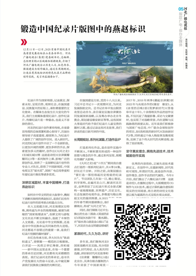 锻造中国纪录片版图中的燕赵标识 ——以区域深耕驱动高质量创新的河北实践 进入新时代,河北的纪录片创作开启了一个全新阶段,以更加开阔的视野、更加多样的手法,探索更加多元的题材,创作出《大河之北》《长城长城》《嘿这就是诗经》《京津冀瓣瓣同心》等一系列制作上乘、影响广泛的原创作品,培养了一支深耕纪录片创作的专业人才队伍,获得了中国新闻奖、中国电视文艺“星光奖”、国家广电总局季度、年度纪录片推优等诸多奖项(识别图片上的二维码关注阅览)。