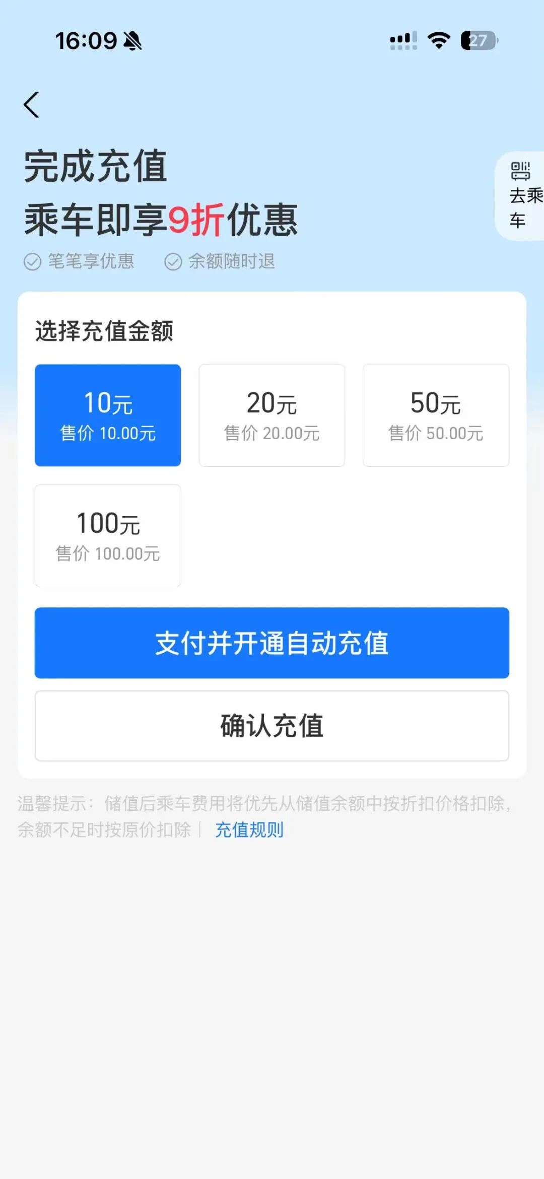 首次随机最高可领取8元乘车充值立减金,立减金可直接用于充值。例如充值10元时,若领取3元立减金,实际仅需支付7元,储值后享笔笔9折乘车优惠。