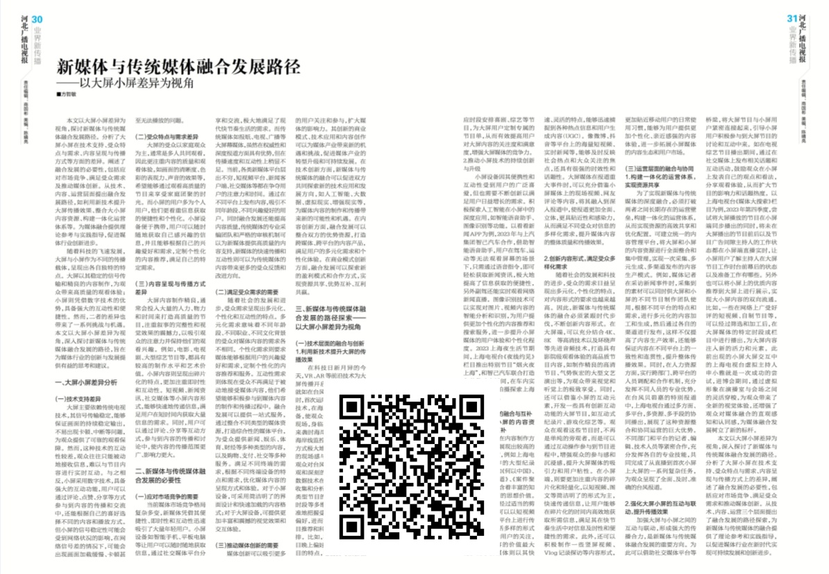 新媒体与传统媒体融合发展路径——以大屏小屏差异为视角 随着科技的飞速发展,大屏与小屏作为不同的传播载体,呈现出各自独特的特点。大屏以其稳定的信号传输和精良的内容制作,为观众带来高质量的观看体验;小屏则凭借数字技术的优势,具备强大的互动性和便捷性。然而,二者的差异也带来了一系列挑战与机遇(识别图片上的二维码关注阅览)。