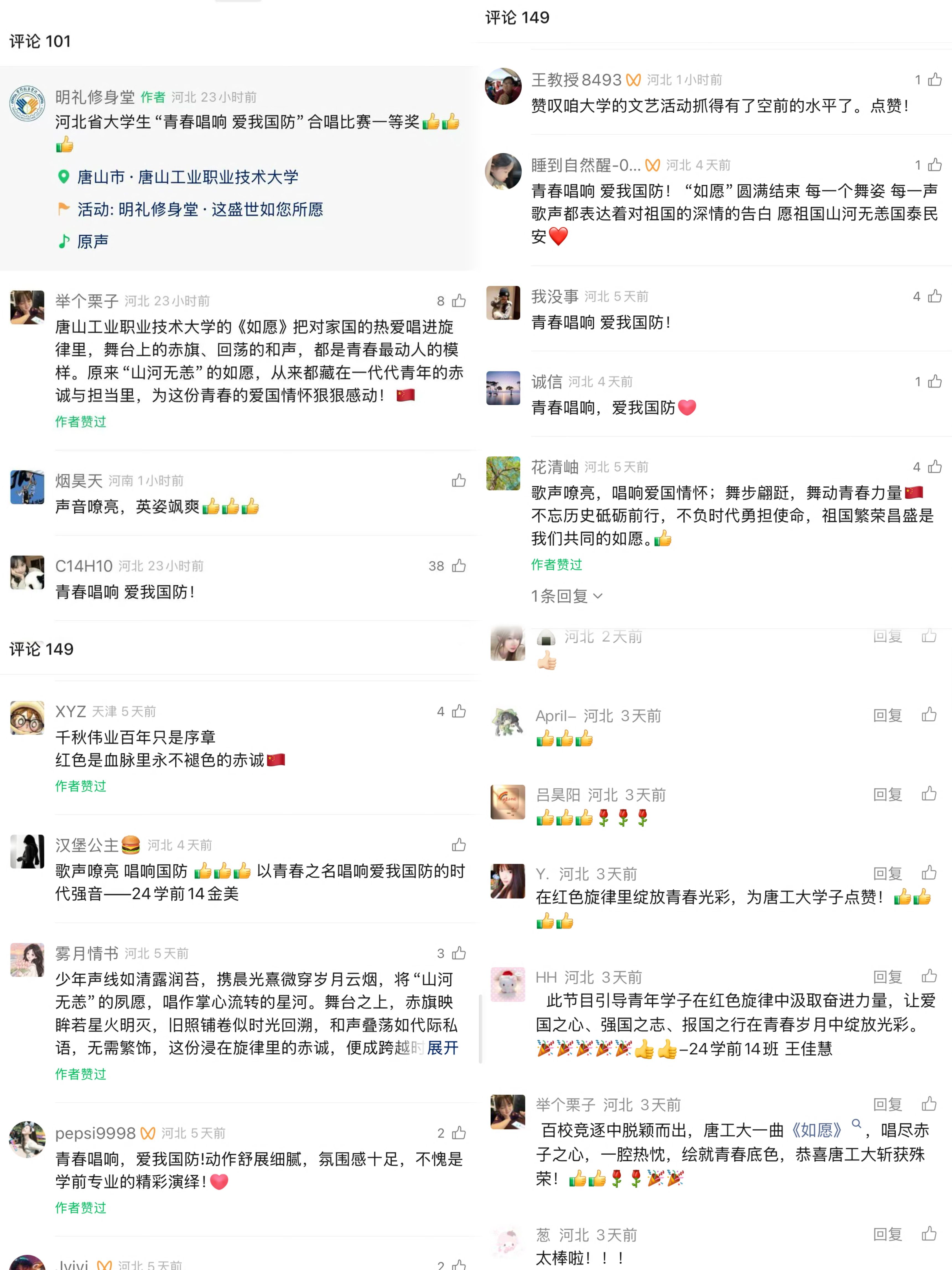 当爱国旋律唱响校园,当红色故事浸润心灵,年轻的学子们用最鲜活的方式诠释爱国情怀,“2025河北省大学生经典爱国歌曲唱响季”活动紧扣“国防教育+艺术融合+青春表达”的核心定位,让经典爱国歌曲在校园广泛传唱,让国防理念在青年心中深深扎根,为全民国防教育高质量发展提供了能复制、可推广的实践样本。