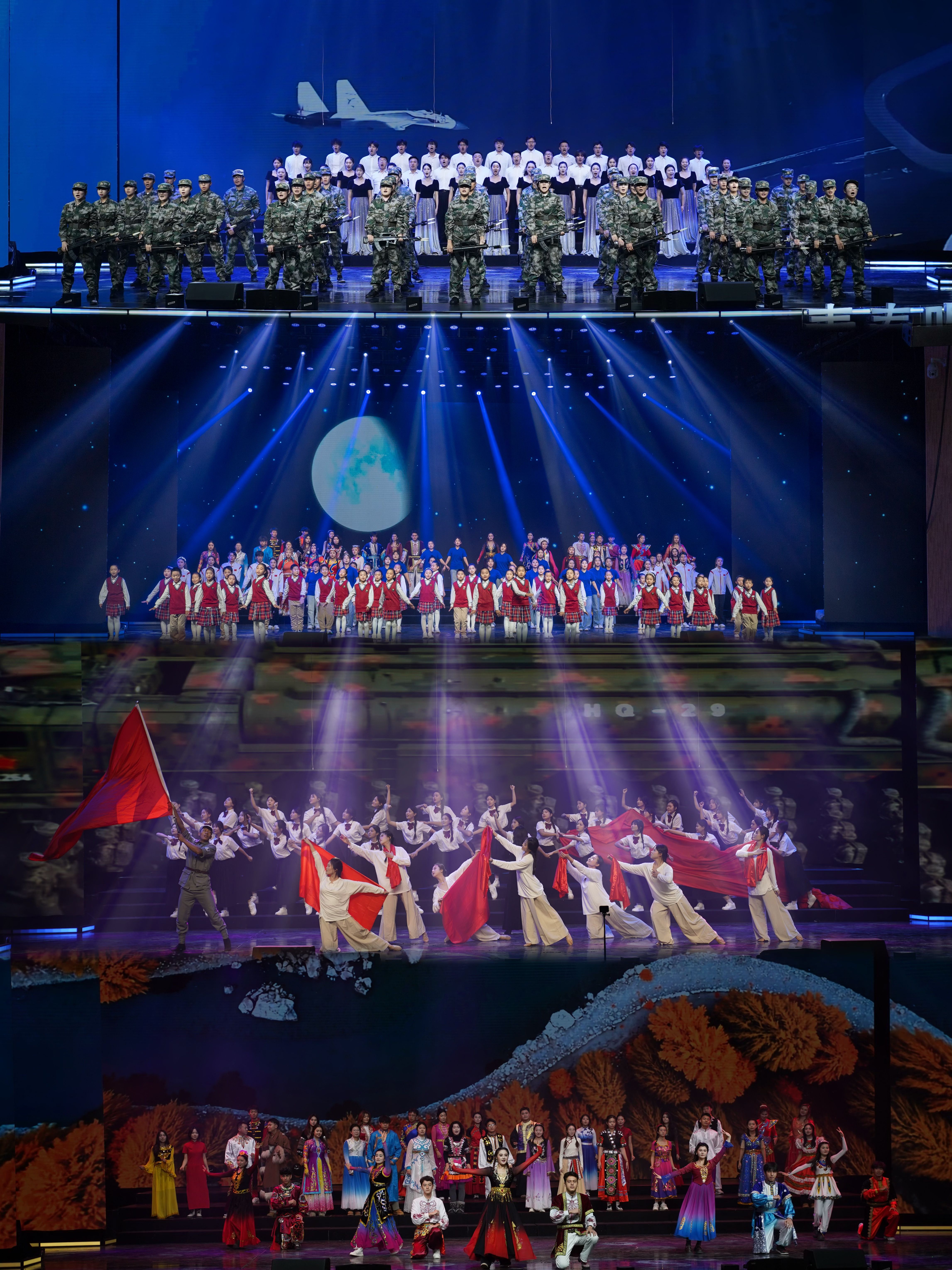 “合唱+”样式,紧扣“国防教育+艺术融合+青春表达”的主题定位,创新打造“合唱+”音乐展演类活动,并以“小栋”从少年时期到大学时期的故事贯穿全场,构筑起“热血·铭记烽火岁月”、“奉献·坚守国防初心”、“担当·扛起青年使命”、“传承·践行国防担当”四幕篇章,让国防教育从“课堂说教”变成“生活浸润”。让国防教育从“被动灌输”变为“主动演绎”,破解传统教育枯燥难题。