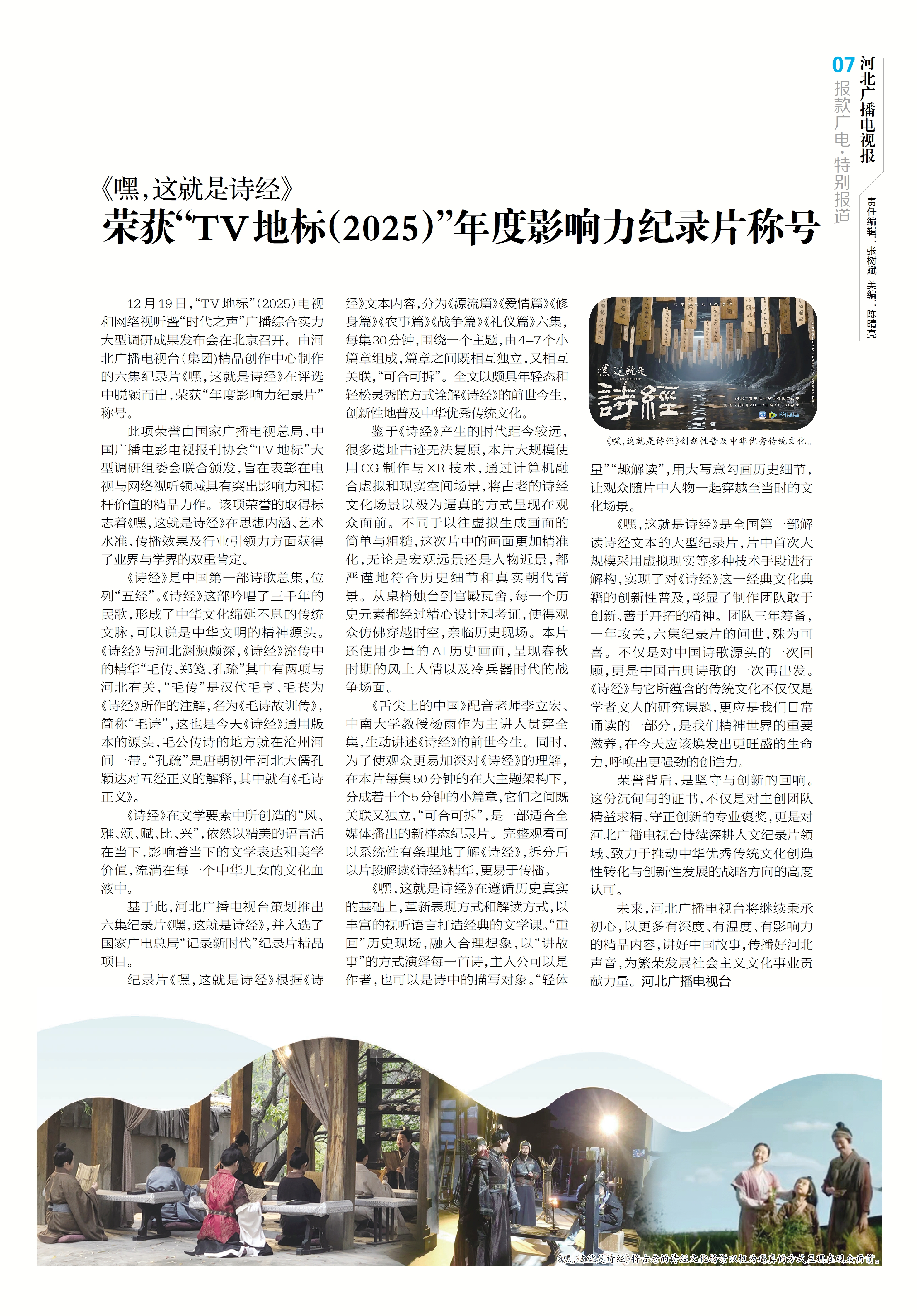 12月19日,“TV地标”(2025)电视和网络视听暨“时代之声”广播综合实力大型调研成果发布会在北京召开。由河北广播电视台(集团)精品创作中心制作的六集纪录片《嘿,这就是诗经》在评选中脱颖而出,荣获“年度影响力纪录片” 称号。