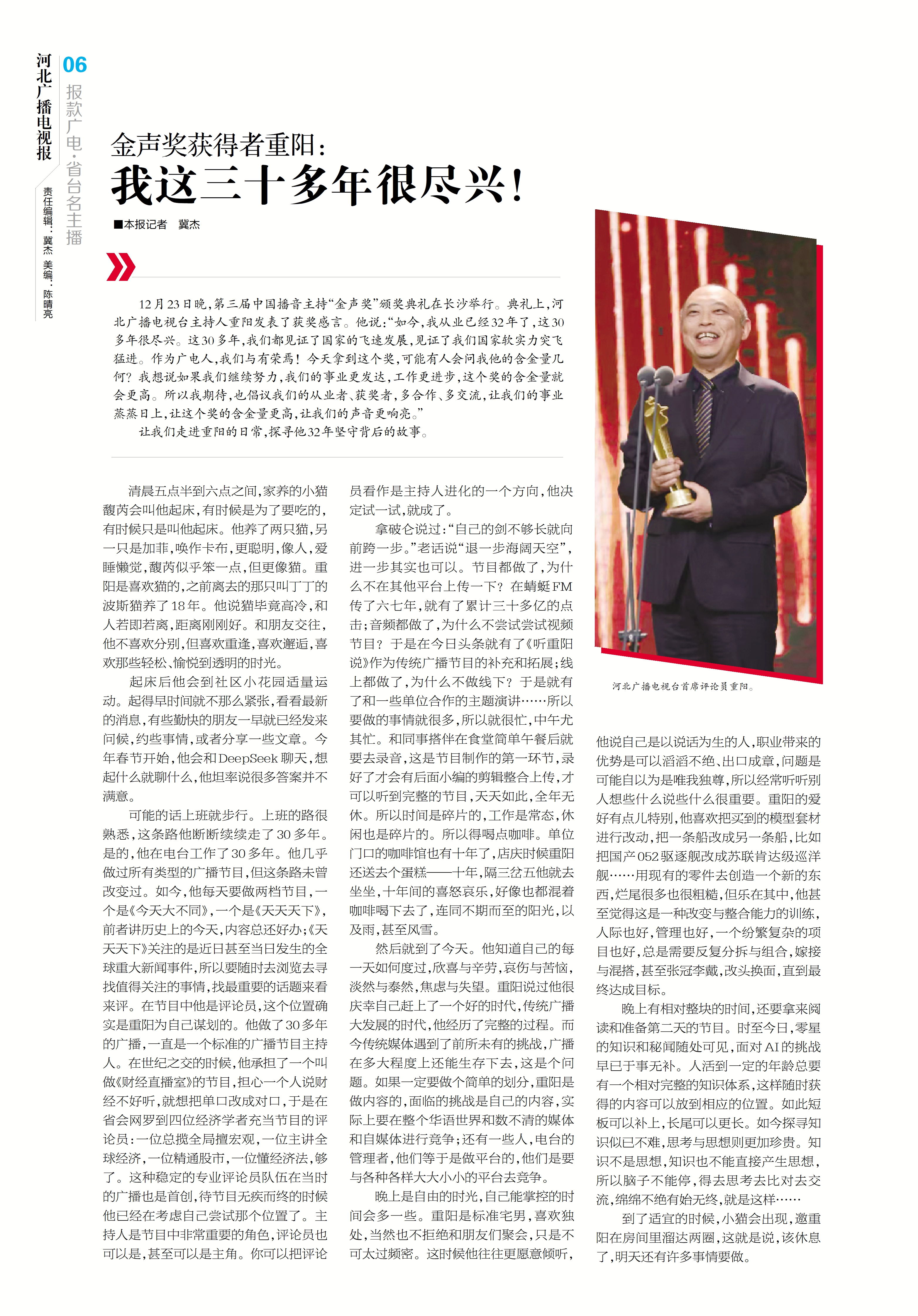 国+社区新媒体报道(河北广播电视报记者 冀杰)12月23日晚,第三届中国播音主持“金声奖”颁奖典礼在长沙举行。典礼上,河北广播电视台主持人重阳发表了获奖感言。他说:“如今,我从业已经32年了,这30多年很尽兴。这30多年,我们都见证了国家的飞速发展,见证了我们国家软实力突飞猛进。作为广电人,我们与有荣焉!今天拿到这个奖,可能有人会问我他的含金量几何?我想说如果我们继续努力,我们的事业更发达,工作更进步,这个奖的含金量就会更高。所以我期待,也倡议我们的从业者、获奖者,多合作、多交流,让我们的事业蒸蒸日上,让这个奖的含金量更高,让我们的声音更响亮。”
