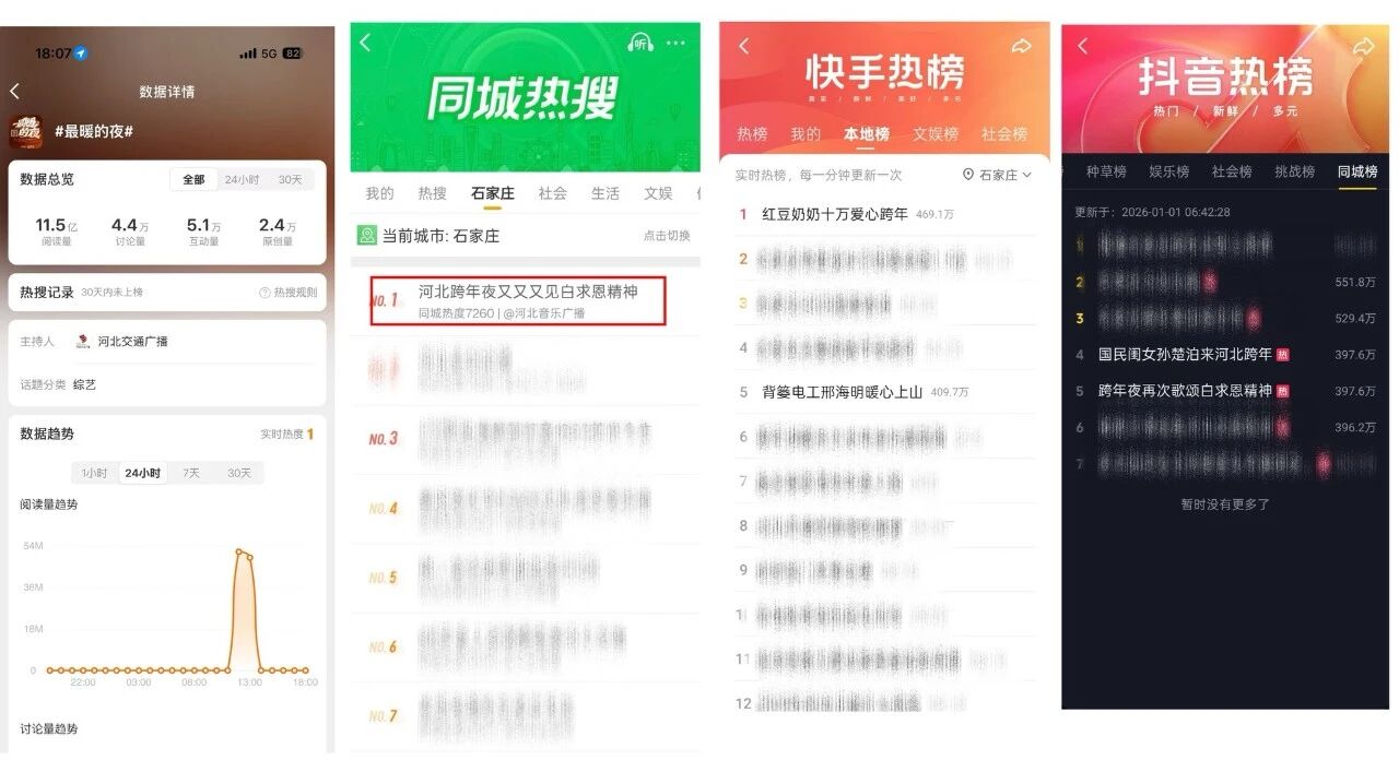 今年跨年盛典走出河北,“红豆奶奶”赵晓凤相关报道荣登山东省各地市本地微博热搜榜第1名;“哏都养老院”登天津本地微博热搜榜榜第4名。