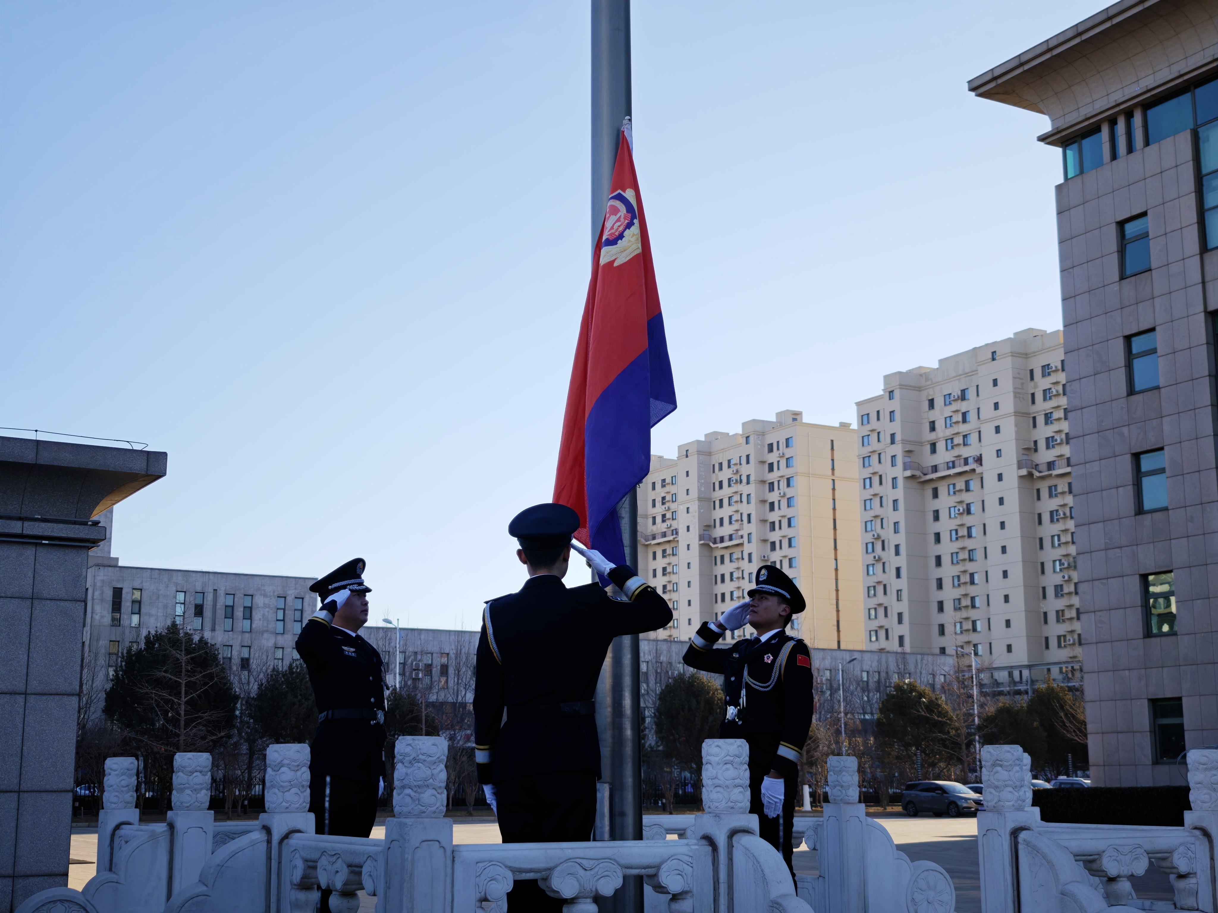 伴随着激昂雄壮的《人民公安向前进》旋律,警旗护卫队迈着矫健整齐的步伐走向旗杆。鲜艳的警旗冉冉升起、猎猎飘扬,映照出全体民警坚毅的面庞,将仪式的庄重氛围推向高潮,进一步凝聚了警心、提振了士气。