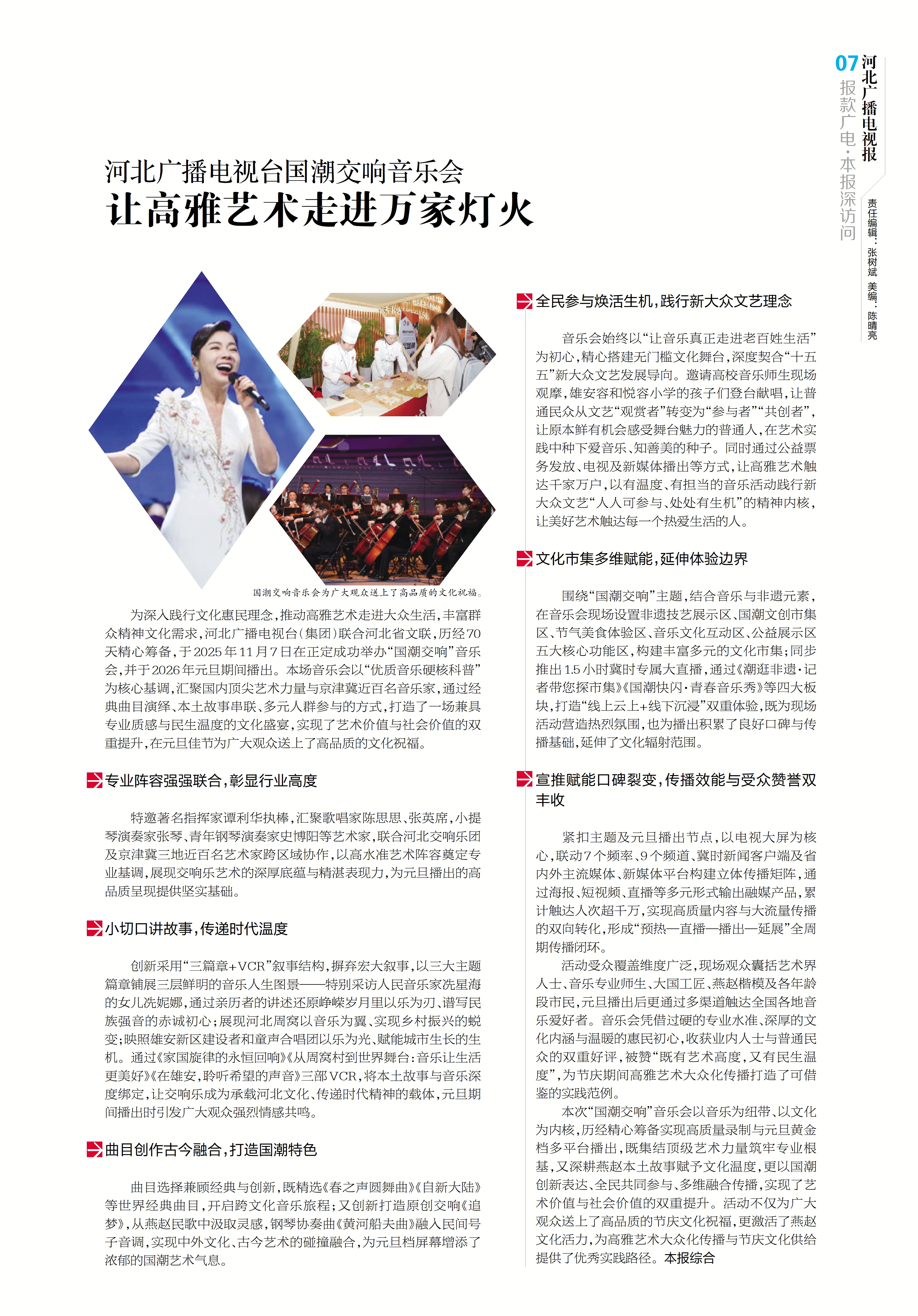 为深入践行文化惠民理念,推动高雅艺术走进大众生活,丰富群众精神文化需求,河北广播电视台(集团)联合河北省文联,历经70天精心筹备,于2025年11月7日在正定成功举办“国潮交响”音乐会,并于2026年元旦期间播出。本场音乐会以“优质音乐硬核科普”为核心基调,汇聚国内顶尖艺术力量与京津冀近百名音乐家,通过经典曲目演绎、本土故事串联、多元人群参与的方式,打造了一场兼具专业质感与民生温度的文化盛宴,实现了艺术价值与社会价值的双重提升,在元旦佳节为广大观众送上了高品质的文化祝福。