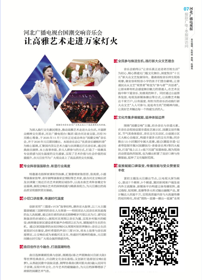 以乐为媒,潮起燕赵 | 河北广播电视台国潮交响音乐会:让高雅艺术走进万家灯火 本场音乐会以“优质音乐硬核科普”为核心基调,汇聚国内顶尖艺术力量与京津冀近百名音乐家,通过经典曲目演绎、本土故事串联、多元人群参与的方式,打造了一场兼具专业质感与民生温度的文化盛宴,实现了艺术价值与社会价值的双重提升,在元旦佳节为广大观众送上了高品质的文化祝福(识别图片上的二维码关注阅览)。