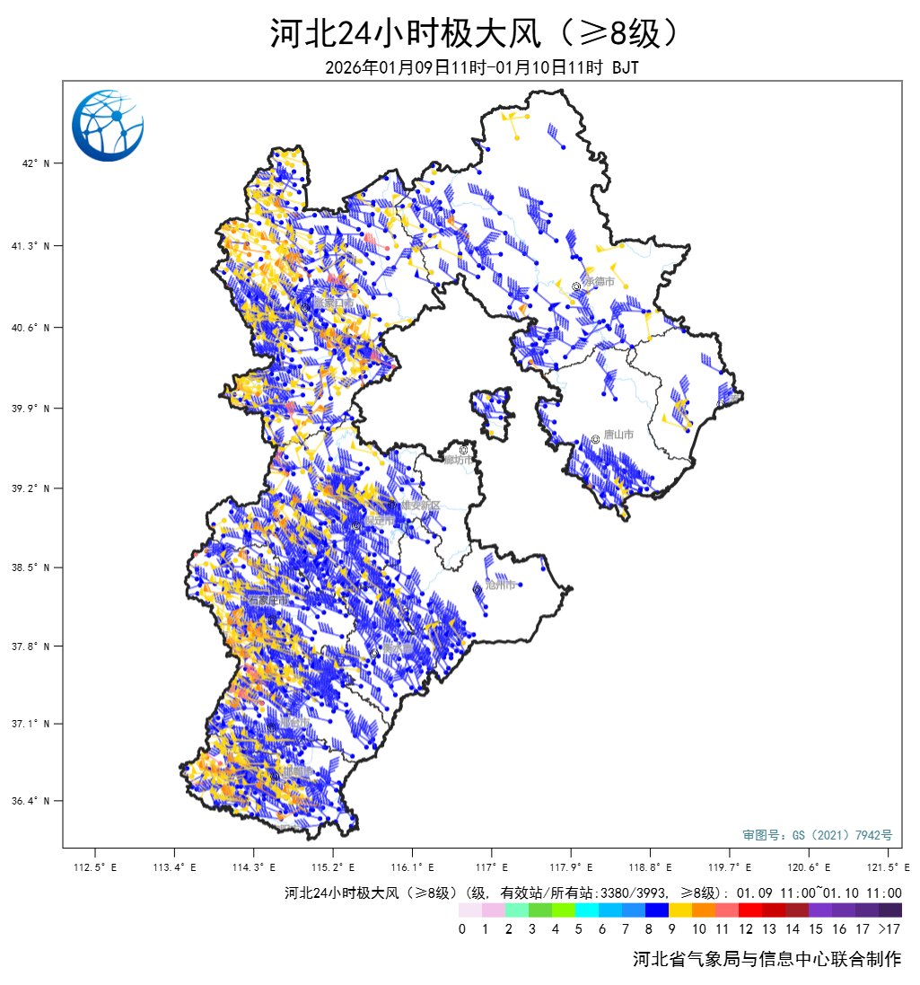 全省多地出现7级以上大风 受冷空气影响,河北本周遭遇大风剧烈降温天气,多地出现7级以上大风。据河北省142个国家级气象站数据统计,1月9日7时至10日7时,全省共有85个国家级气象站出现7级以上大风,其中内丘县风速最大,瞬时风力达11级。由于风力较大,人体的“风寒效应”非常明显,体感温度远低于实际气温,寒冷感刺骨。气象部门提醒,近期河北风力较强,气温偏低,公众需注意防寒保暖,同时,及时关注最新天气预报,刮风时尽量避免在广告牌、临时搭建物或大树下逗留,注意出行安全。