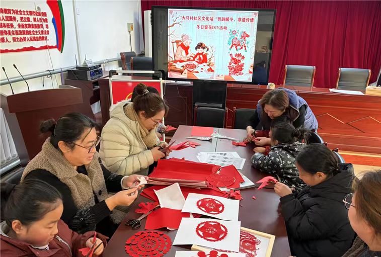 大马村社区新时代文明实践站同步开展“剪韵暖冬 非遗传情”窗花DIY活动。志愿者先向居民讲解窗花背后的年俗文化与吉祥寓意,再一步步示范折纸、画稿、裁剪技巧,针对不同年龄段居民进行一对一指导。红纸在指尖翻飞,转眼间,一幅幅造型灵动的福字、雪花窗花新鲜出炉,大家互相展示作品,分享创作喜悦。