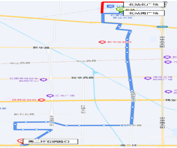 1. 起止点:始发站南二环石铜路口不变,终点站由北站南广场调整为北站北广场。