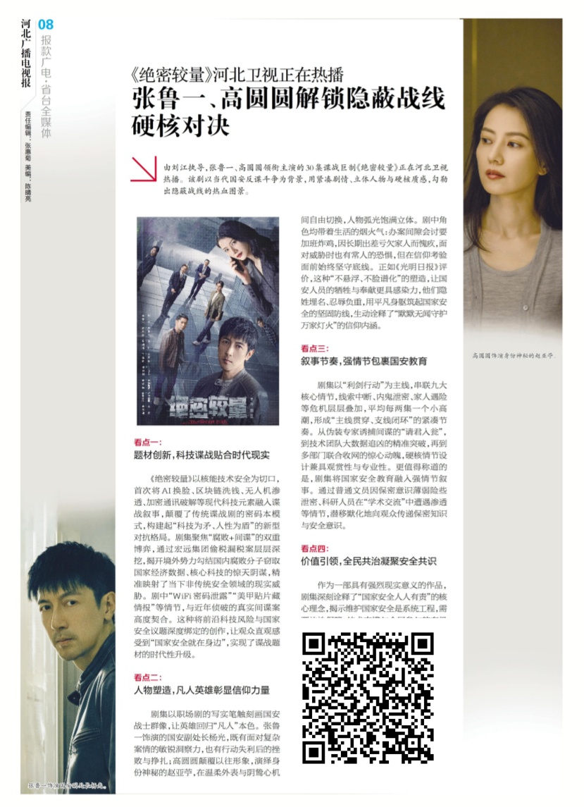 《绝密较量》河北卫视正在热播,张鲁一、高圆圆解锁隐蔽战线硬核对决 由刘江执导,张鲁一、高圆圆领衔主演的30集谍战巨制《绝密较量》正在河北卫视热播。该剧以当代国安反谍斗争为背景,用紧凑剧情、立体人物与硬核质感,勾勒出隐蔽战线的热血图景(识别图片上的二维码关注阅览)。