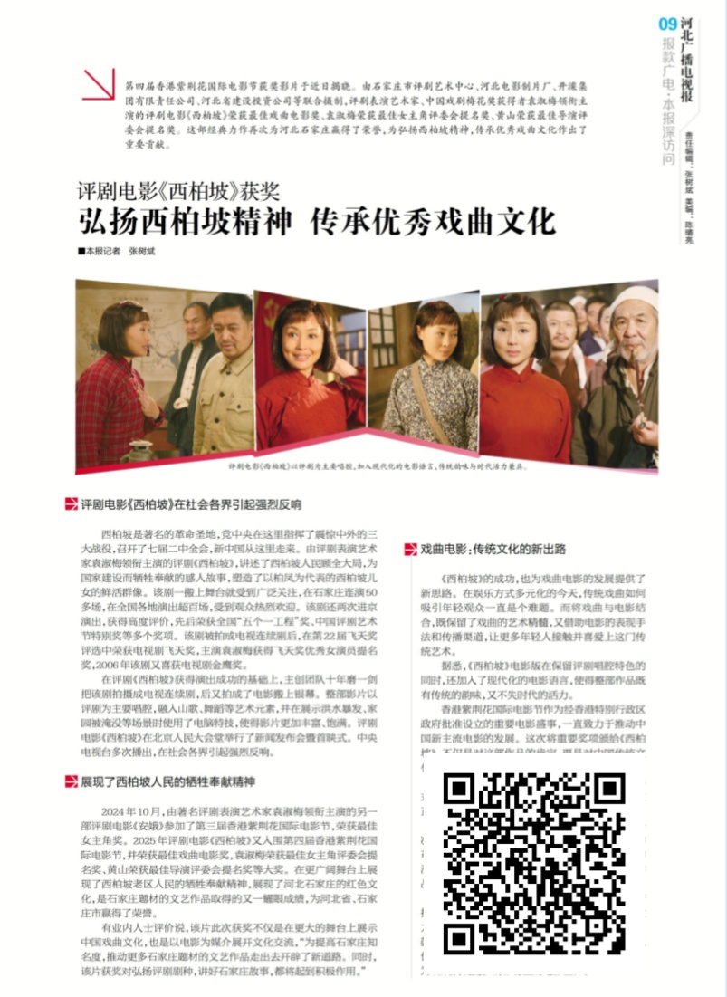 评剧电影《西柏坡》获奖——弘扬西柏坡精神 传承优秀戏曲文化 第四届香港紫荆花国际电影节获奖影片近日揭晓。由石家庄市评剧艺术中心、河北电影制片厂、开滦集团有限责任公司、河北省建设投资公司等联合摄制,评剧表演艺术家、中国戏剧梅花奖获得者袁淑梅领衔主演的评剧电影《西柏坡》荣获最佳戏曲电影奖、袁淑梅荣获最佳女主角评委会提名奖、黄山荣获最佳导演评委会提名奖。这部经典力作再次为河北石家庄赢得了荣誉,为弘扬西柏坡精神,传承优秀戏曲文化做出了重要贡献(识别图片上的二维码关注阅览)。