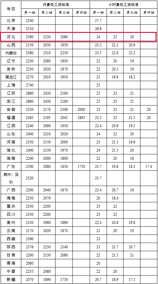 全国各地最低工资标准公布,河北第一档月最低工资标准2380元 1月12日,人社部官网公布全国各省、自治区、直辖市最低工资标准情况。目前,最低工资标准档次最多为四档。其中,河北第一档月最低工资标准为2380元,第一档小时最低工资标准为24元;第二档月最低工资标准为2230元,第二档小时最低工资标准为22元;第三档月最低工资标准为2080元,第三档小时最低工资标准为20元。