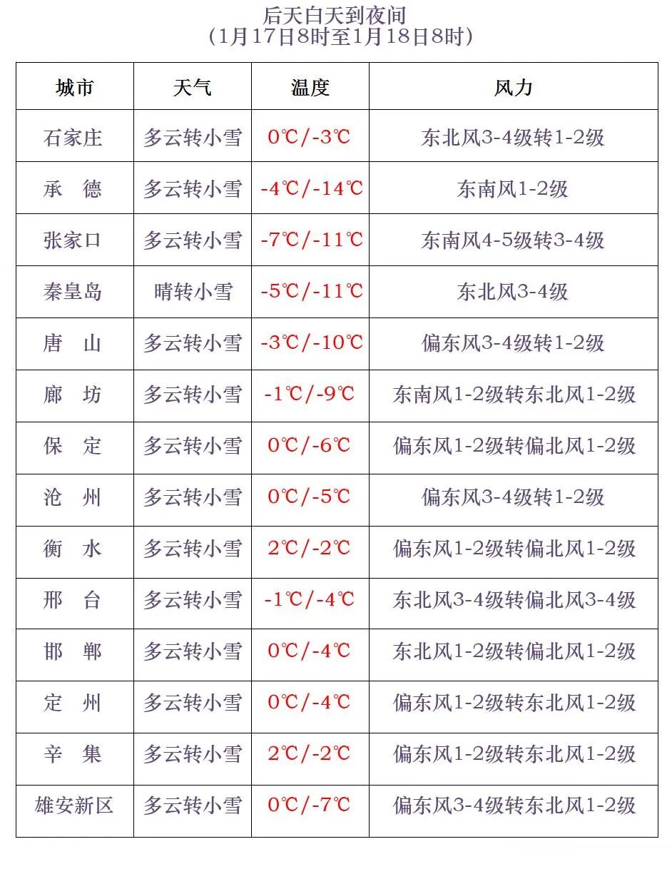 17日夜间到18日,全省阴有小雪或零星小雪,其中沧州中东部、衡水东部有中雪,局地有大雪。