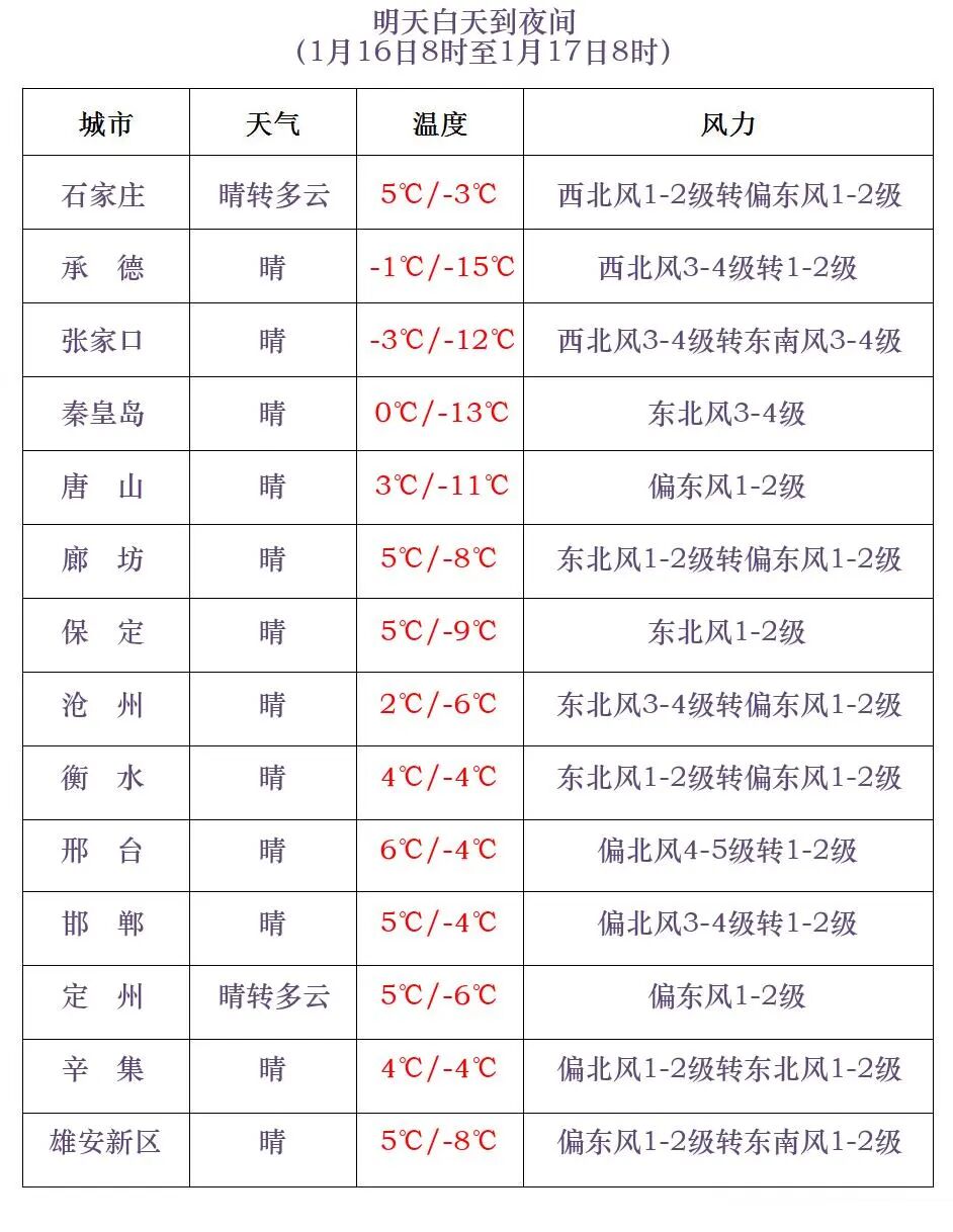 明天白天,张家口、承德北部、保定西北部有西北风4到5级,阵风6到7级,沧州东部、衡水南部、邢台、邯郸有北到东北风4到5级,阵风6到7级。