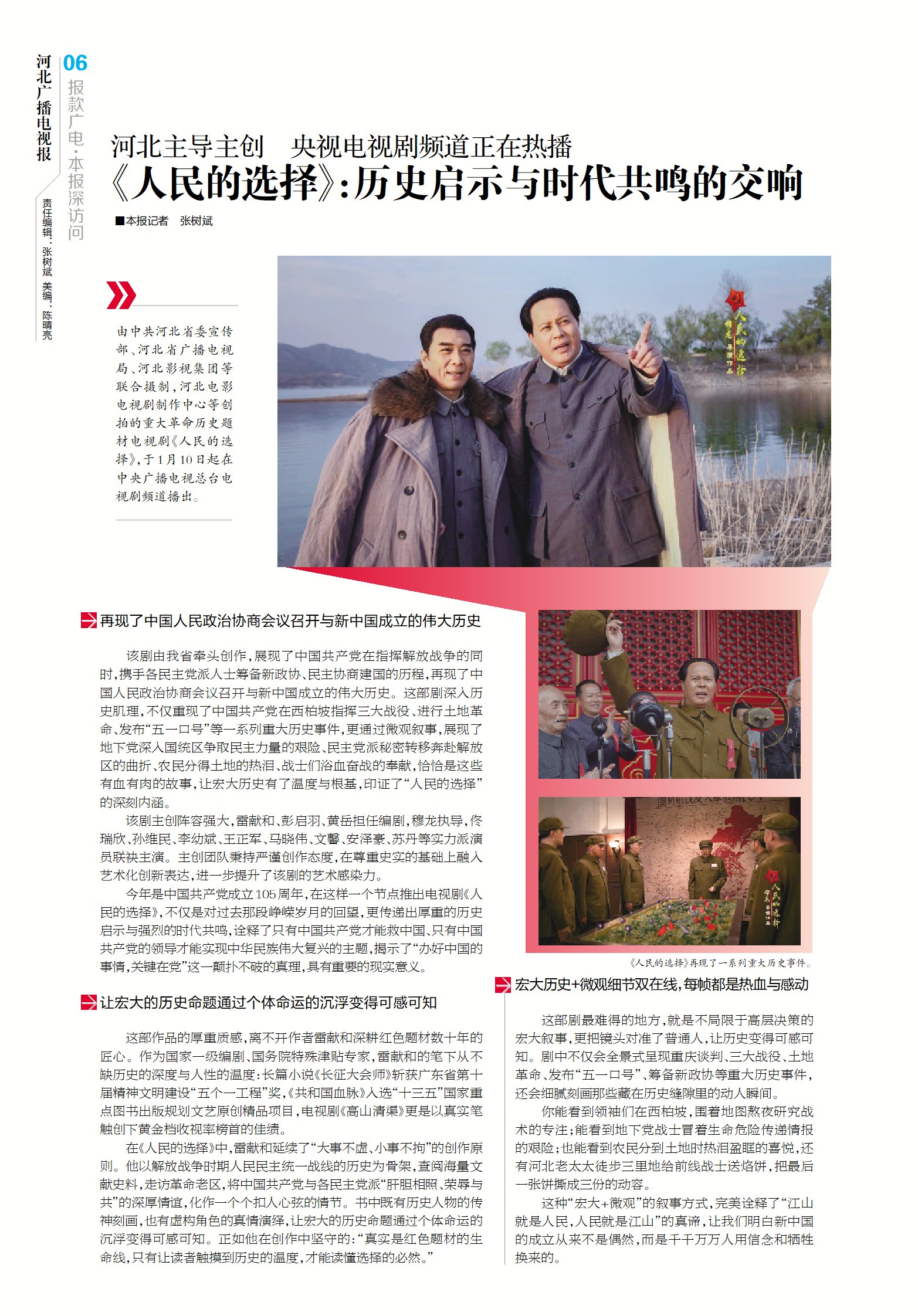 由中共河北省委宣传部,河北省广播电视局、河北影视集团等联合摄制,河北电影电视剧制作中心等创拍的重大革命历史题材电视剧《人民的选择》,于1月10日起在中央广播电视总台电视剧频道播出。