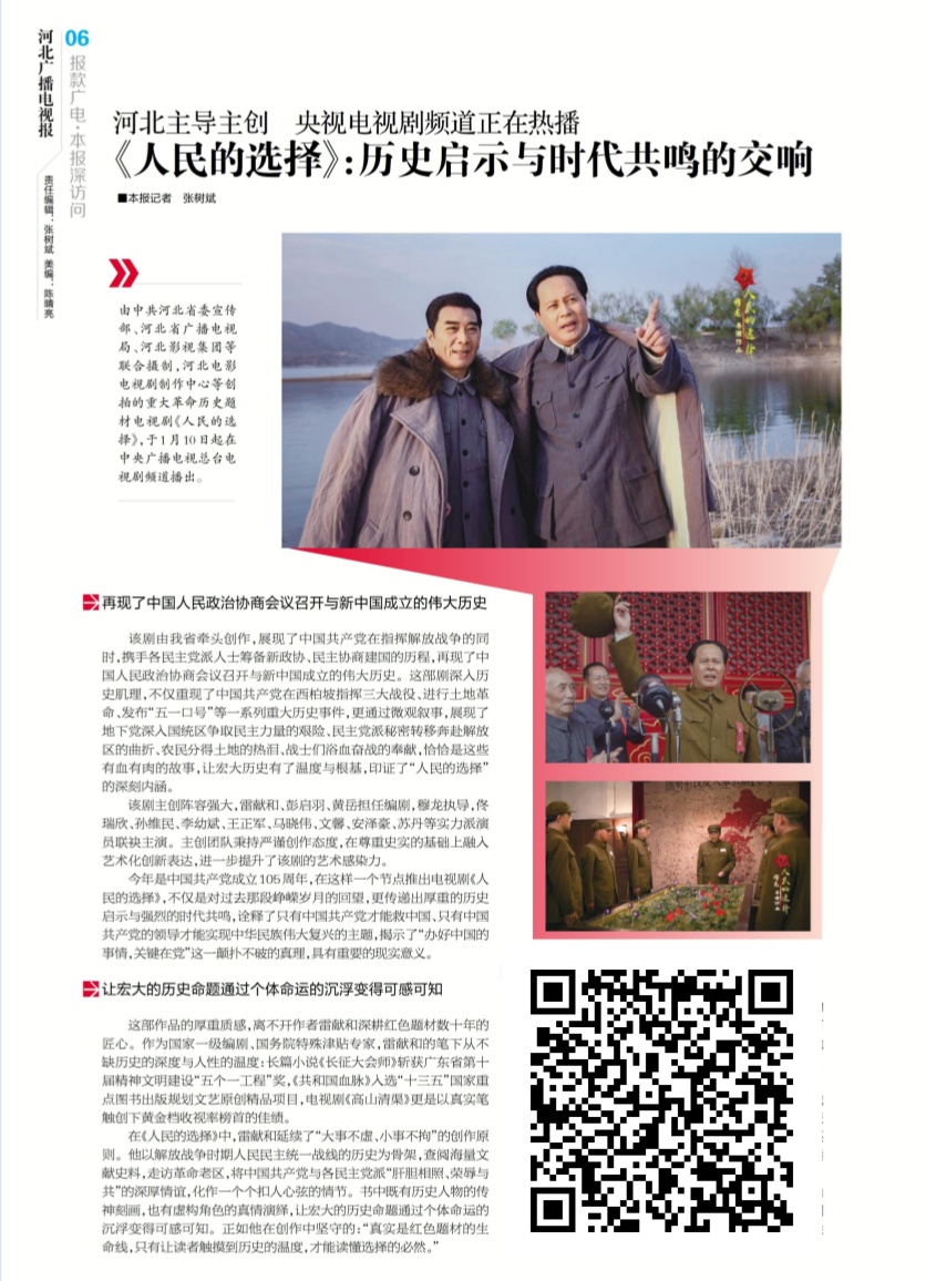 河北主导主创重大革命历史题材电视剧《人民的选择》央视电视剧频道播出 今年是中国共产党成立105周年,在这样一个节点推出电视剧《人民的选择》,不仅是对过去那段峥嵘岁月的回望,更传递出厚重的历史启示与强烈的时代共鸣,诠释了只有中国共产党才能救中国、只有中国共产党的领导才能实现中华民族伟大复兴的主题,揭示了“办好中国的事情,关键在党”这一颠扑不破的真理,具有重要的现实意义(识别图片上的二维码关注阅览)。