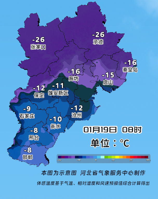 河北迎断崖式降温 河北省气象台1月18日发布寒潮蓝色预警信号:今天(1月19日)到20日早晨,张家口、承德、保定西北部、沧州东部最低气温持续下降10~12℃,上述地区达到寒潮标准;其他地区下降5~9℃。20日早晨,张家口、承德、秦皇岛北部、保定西北部最低气温降至-26~-18℃,其中坝上地区降至-36~-27℃,其他地区降至-17~-7℃。石家庄多云转晴,-9~-3°C;雄安新区多云转晴,-11~-5°C;北京晴,-13~-5°C。
