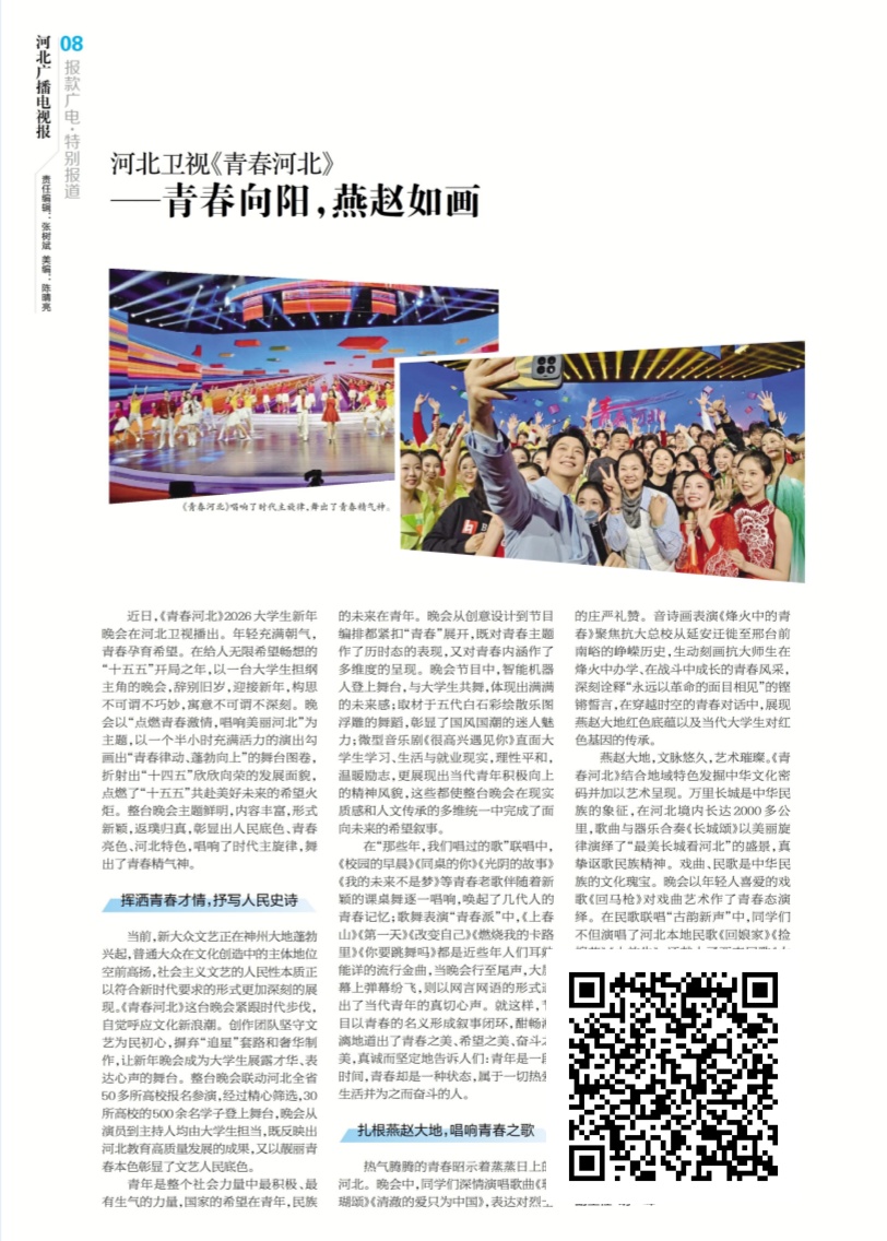 青春向阳,燕赵如画——观《青春河北》2026大学生新年晚会有感 晚会以“点燃青春激情,唱响美丽河北”为主题,以一个半小时充满活力的演出勾画出“青春律动、蓬勃向上”的舞台图卷,折射出“十四五”欣欣向荣的发展面貌,点燃了“十五五”共赴美好未来的希望火炬。整台晚会主题鲜明,内容丰富,形式新颖,返璞归真,彰显出人民底色、青春亮色、河北特色,唱响了时代主旋律,舞出了青春精气神(识别图片上的二维码关注阅览)。