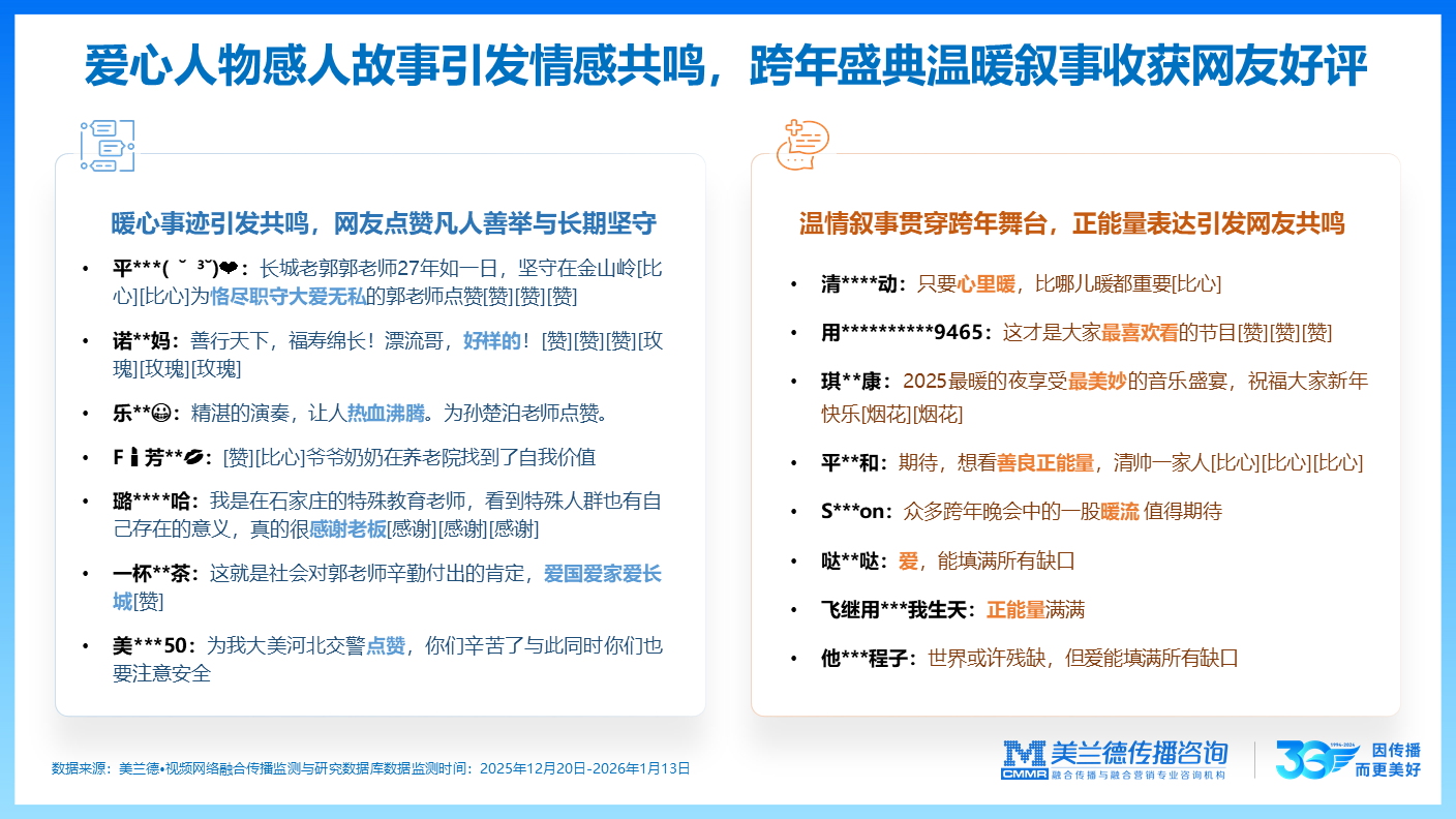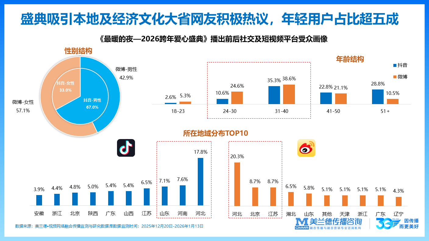 美兰德数据显示:热议用户中,年轻群体占比超五成,证明公益叙事能精准触达社交活跃人群,形成“正能量→大流量→强共鸣”的良性传播闭环。这种以情感人、以实动人的传播策略,不仅重塑了跨年晚会的价值导向,也为主流媒体在融合传播中探索出一条“暖传播”实践路径。