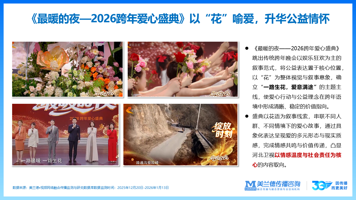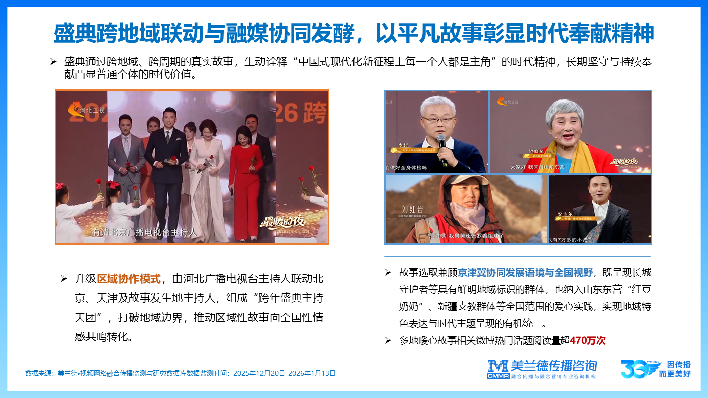 权威咨询机构美兰德数据显示:2025年12月20日-2026年1月13日期间,晚会直播及热门话题累计传播17.9亿次,多平台热搜上榜125次,在榜时长近690小时。它以“花”为意象的叙事策略深化了公益情怀,并以真实人物故事推动地方典型走向全国,为省级广电突破同质化竞争、打造主题IP提供了极具参考价值的“河北样本”。