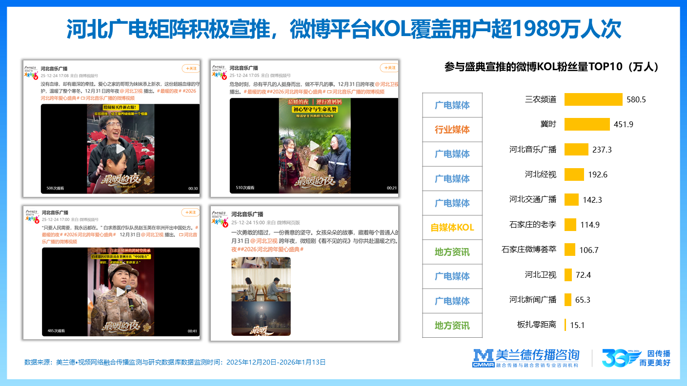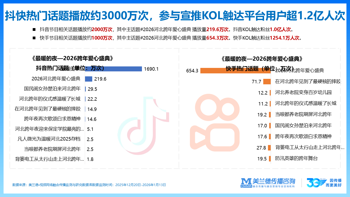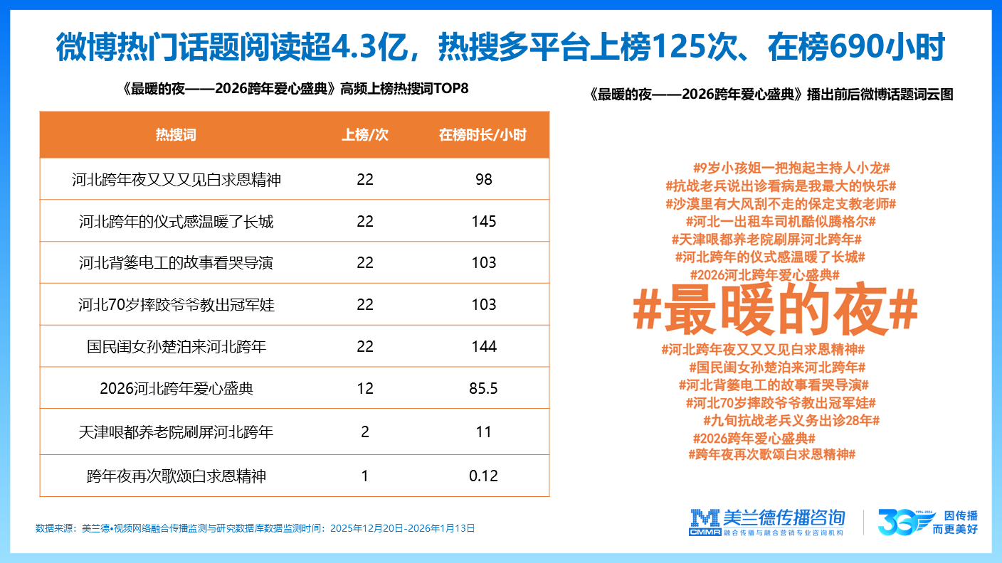 在跨年晚会普遍追求明星效应与娱乐的背景下,河北广播电视台《最暖的夜—2026跨年爱心盛典》以“公益叙事”为核心,成功实现了从“流量聚合”到“价值共鸣”的传播升级。数据监测期间,晚会直播及热门话题累计传播17.9亿次,覆盖用户1.4亿人次,其中微博热门话题阅读量超4.3亿次,抖音、快手热门话题播放约3000万次,充分印证了公益内容具备强大的破圈传播潜力。