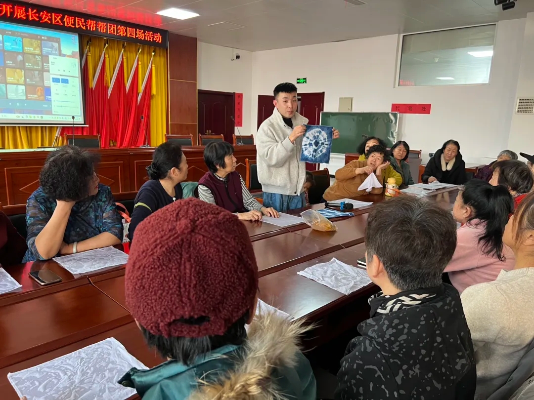 健康讲座落下帷幕,非遗扎染体验随即开场。扎染非遗传承人孙建甲化身“文化向导”,从扎染千年历史娓娓道来,再到折叠、捆绑、浸染等制作步骤的分步演示,将这项传统技艺的魅力展现得淋漓尽致。居民们纷纷领取纯棉方巾、染料、线绳等材料,围在传承人身边认真学习。在一双双巧手下,普通的方巾经过扎结、染色、拆线、漂洗,蜕变成花纹独特、色彩绚丽的扎染作品。大家捧着自己的“专属创作”互相欣赏、合影留念,欢声笑语回荡在社区的每一个角落。