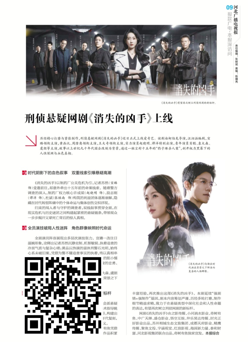 刑侦悬疑网剧《消失的凶手》上线 刑侦悬疑网剧《消失的凶手》近日正式上线爱奇艺。该剧由柯伯龙导演,汪汨涵编剧,宣璐领衔主演,黄品沅、周澄奥领衔主演,王大奇领衔主演,实力演员赵晓明、谭洋特别出演,青年演员肖聪、袁大森、虞朗等主演,故事以上世纪九十年代国企改制为背景,通过一桩尘封十五年的“豹子滩杀人案”,剖开权力黑幕下的人性深渊与血色真相(识别图片上的二维码关注阅览)。