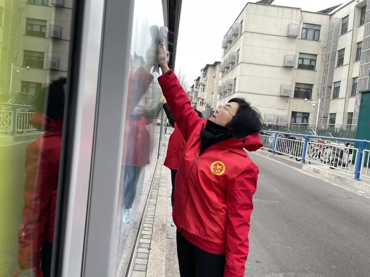 活动中,志愿者们分工协作、干劲十足,纷纷弯腰将东倒西歪的共享单车、自行车、电动自行车逐一扶正、归位,整齐摆放到指定停放区域。经过一番忙碌,原本杂乱的停车区域变得井然有序,人行道恢复了畅通,既为市民出行提供了便利,也为城市增添了整洁之美。完成单车规整工作后,志愿者们又拿起抹布,对公交站牌、候车亭护栏、玻璃橱窗等公共设施进行仔细擦拭,认真清除积尘与污渍,公共设施焕然一新。