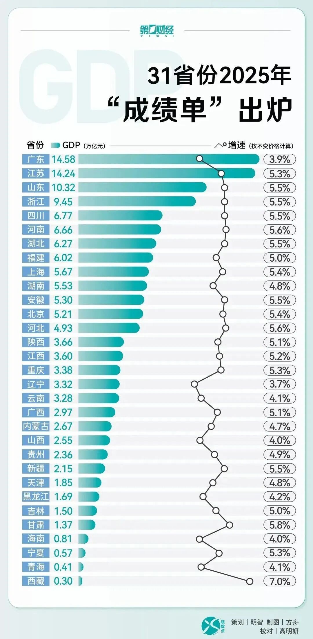 河北GDP增速全国第三 全国31个省份去年GDP数据已全部揭晓,西藏、甘肃、河南和河北增速位居前三位,分别增长了7.0%、5.8%、5.6%和5.6%。这些省份高速增长的原因分别代表了当前经济4个发动机,大基建、资源开发和新能源汽车等制造业。在总量排名上,31个省份基本上保持稳定,只有重庆超越辽宁发生变动,二者互换了位次。2025年,重庆和辽宁GDP分别为33757.93亿和33182.9亿元,重庆超过了辽宁575亿元。