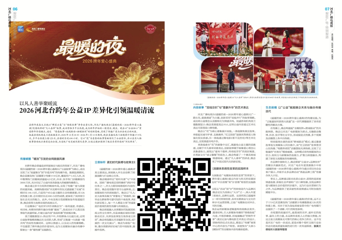 以凡人善举聚暖流——2026河北台跨年公益IP差异化引领温暖清流! 在跨年夜各大卫视以“群星云集”与“劲歌热舞”争夺流量之际,河北广播电视台《最暖的夜—2026跨年爱心盛典》凭借纯粹的“凡人善举”叙事,成功登陆多平台热搜,成为新年伊始的一股清流、暖流。晚会以“公益初心”重设跨年价值锚点,通过 “情感叙事+地域联动+融媒协同” 的创新策略,实现了传播广度与社会效应的双赢(识别图片上的二维码关注阅览)。