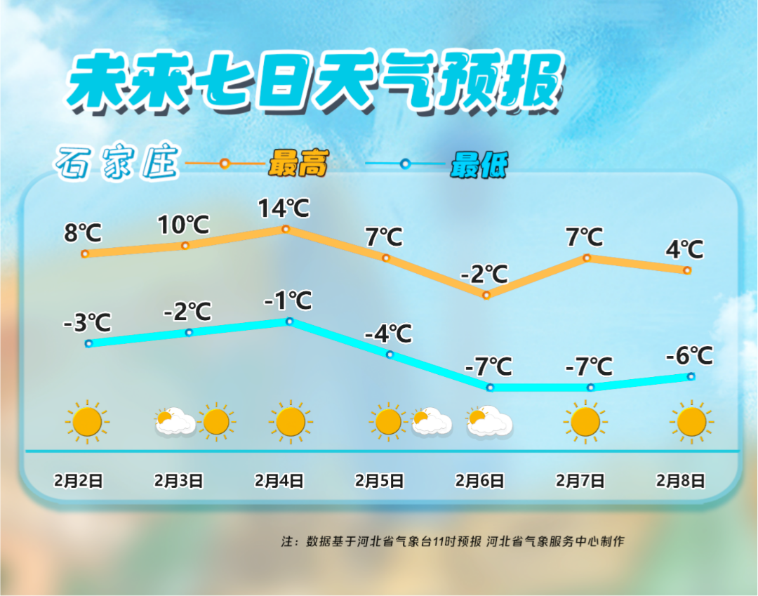 河北:大回暖后大降温 未来两天,我国中东部大部维持升温的趋势,不少地方最高气温累计升幅可达5至10℃,2月4日前后气温将达近期高点。我国大部地区会在较同期偏暖的情况下进入立春节气,部分地区可能度过2026年来最暖和的一天,最高气温15℃线最北推进到河北南部,石家庄4日最高气温可达14℃,立春当天暖如春分。5日开始,随着新一轮冷空气南下,中东部又会自北向南迎接一波断崖式降温,从温暖如春到再掉入“冰窟窿”,不少地方只要1-2天的时间,冷暖急转来得猝不及防。我省北部地区最低气温下降7~9℃,局地下降10~12℃,其他地区下降3~6℃。