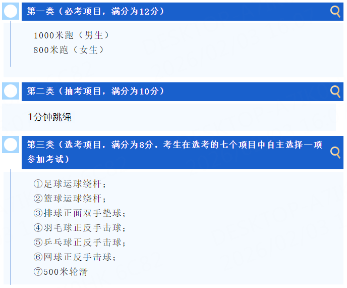 随着石家庄市中考体育抽考项目揭晓,2026年石家庄市中考体育项目已全部确定。2026年中考体育满分为50分(过程性考核20分,现场测试30分),其中现场测试项目包括以下三类: