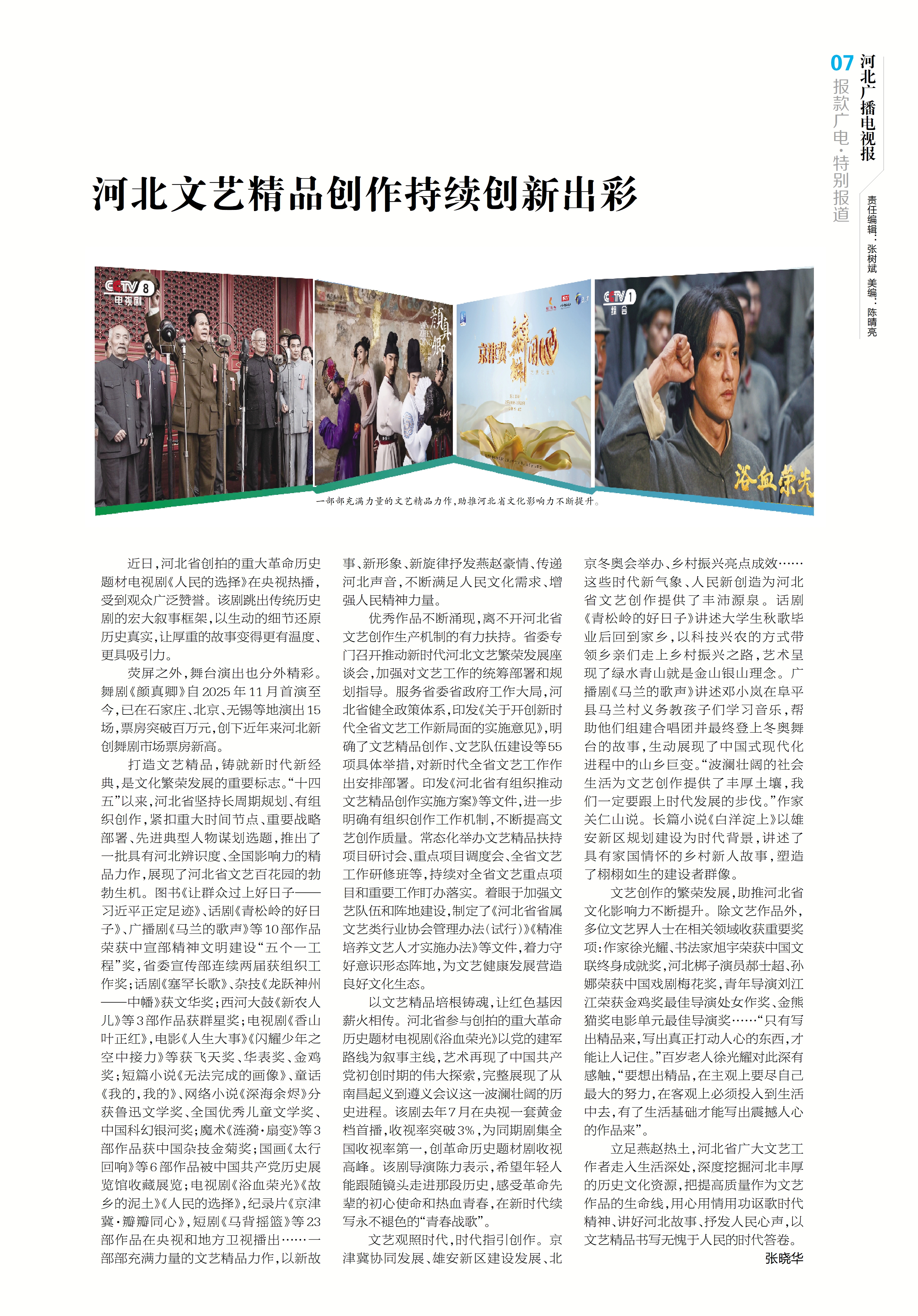 立足燕赵热土,河北省广大文艺工作者走入生活深处,深度挖掘河北丰厚的历史文化资源,把提高质量作为文艺作品的生命线,用心用情用功讴歌时代精神、讲好河北故事、抒发人民心声,以文艺精品书写无愧于人民的时代答卷。张晓华